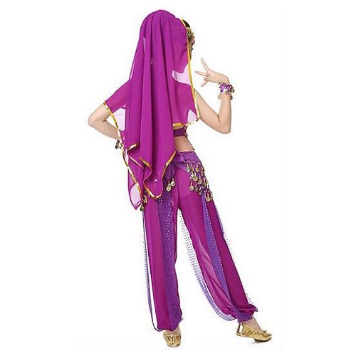 This new belly Indian dance costume is made up of 7 pieces. They are a trouser, a waist band with gold medal sequin.Trouser is free size with elastic waist band to fit the body.A Top with heavy gold sequin , a scarf to cover the back side, 2 hand bands with gold sequin and a gold plated metal head band with a red stud.100- is suitable 5-6 years, 110 is for 6-7 yrs, 120 for 7-8 yrs, 130 for age 8-9, 140 just right for 9-10 years and 150 for 10-11 years.. Size 160 is for 11-12 years.Fabric is easily washable and maintained.