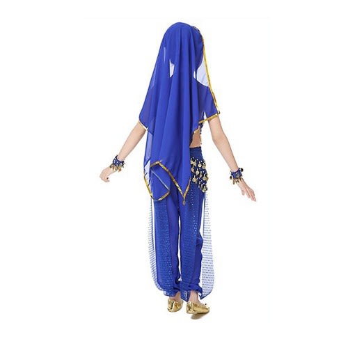 This new belly Indian dance costume is made up of 7 pieces. They are a trouser, a waist band with gold medal sequin.Trouser is free size with elastic waist band to fit the body.A Top with heavy gold sequin , a scarf to cover the back side, 2 hand bands with gold sequin and a gold plated metal head band with a red stud.100- is suitable 5-6 years, 110 is for 6-7 yrs, 120 for 7-8 yrs, 130 for age 8-9, 140 just right for 9-10 years and 150 for 10-11 years.. Size 160 is for 11-12 years.Fabric is easily washable and maintained.