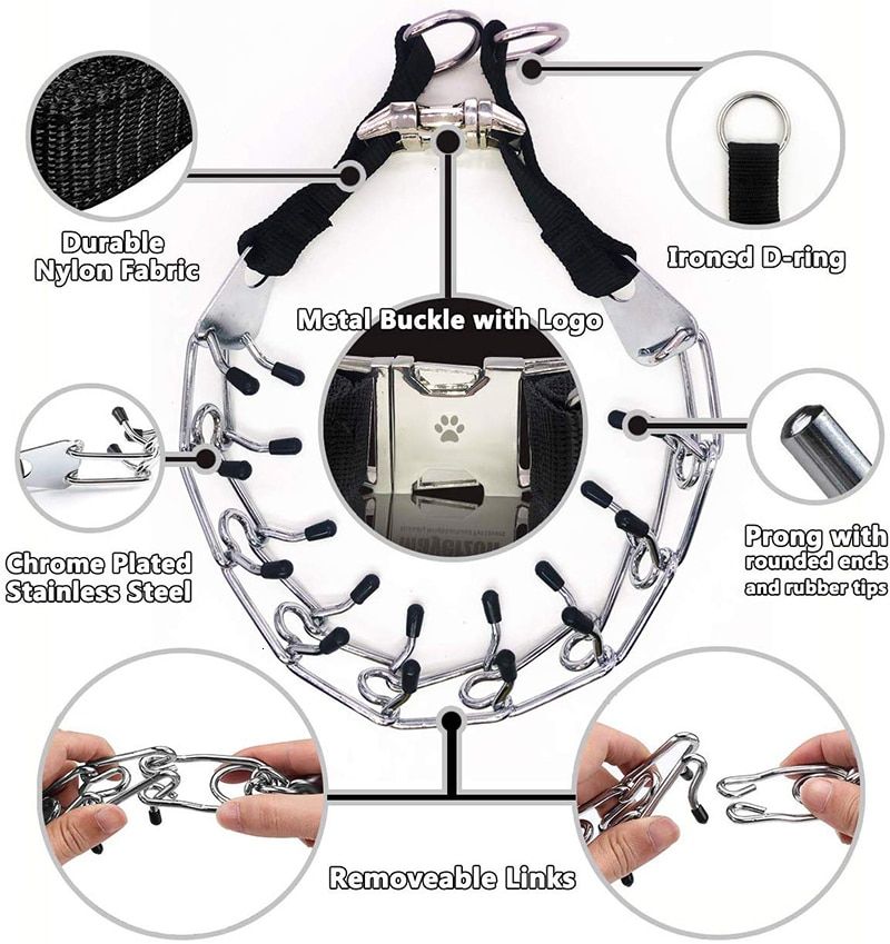 Durable Nylon fabric/ Ironed D-ring/ Prong with rounded ends and rubber tips / Removable links/ Chrome Plated Stainle Steel