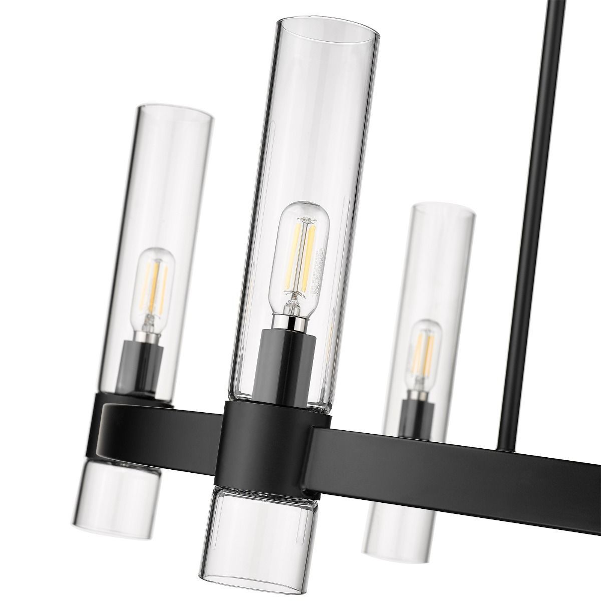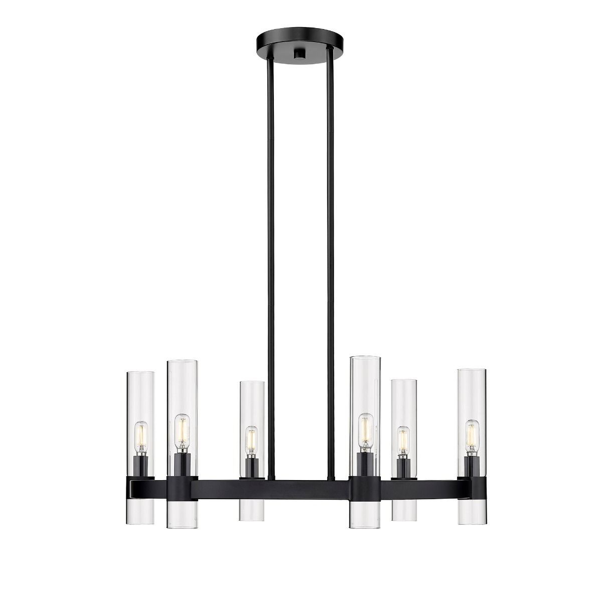 Bennet 6-light cylinder chandelier by OVE Decors. From its matte black finish, elegant circular iron metal structure and six slim clear glass cylinder shades, the Bennet adds sophisticated presence to your decoration. Dimmable exposed filament LED bulbs give industrial edge, with just over 16 inches of height adjustability to ensure the perfect position over your dining table.