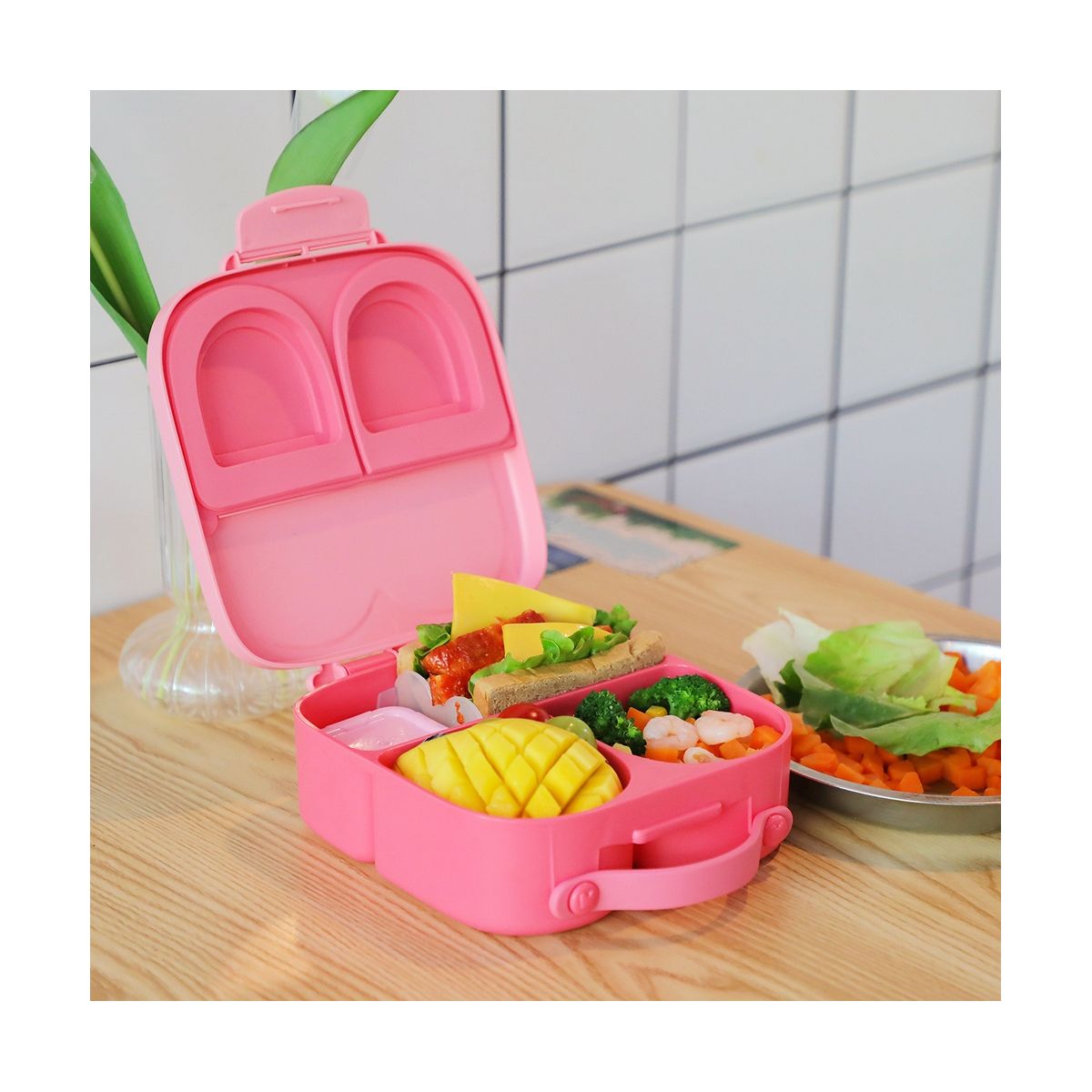 Bento box can to 1400ml of food, a compartment can hold a full sandwich or main course, and if your lunch is bigger, the removable divider provides a fourth compartment for extra food .