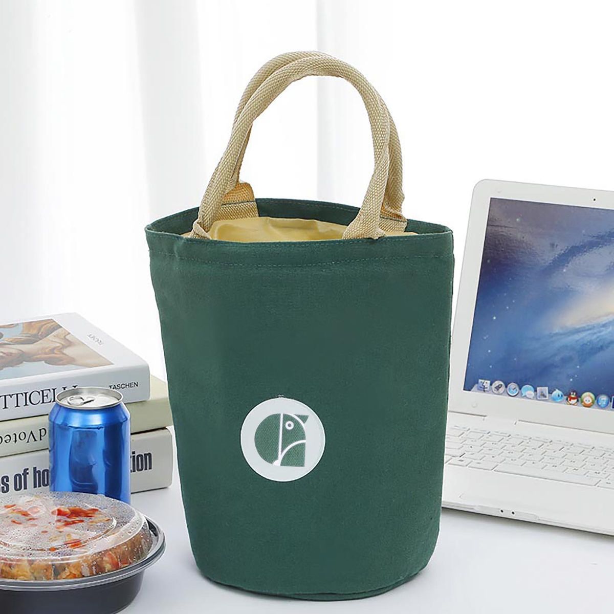 The lunch bag features a drawstring closure and an aluminum foil lining, which provides the functions of insulation, water resistance, dust resistance and stain resistance.
