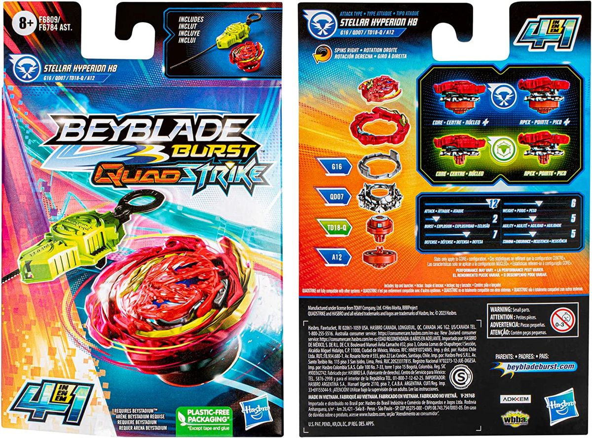 - CUSTOMIZE THE CLASH: Includes 1 right-spin Beyblade Burst QuadStrike Stellar Hyperion H8 G16 QD07 TD18-Q A12 top and launcher. Customize top to Core and Apex mode for defense type or to Core+ and Apex+ mode for attack type