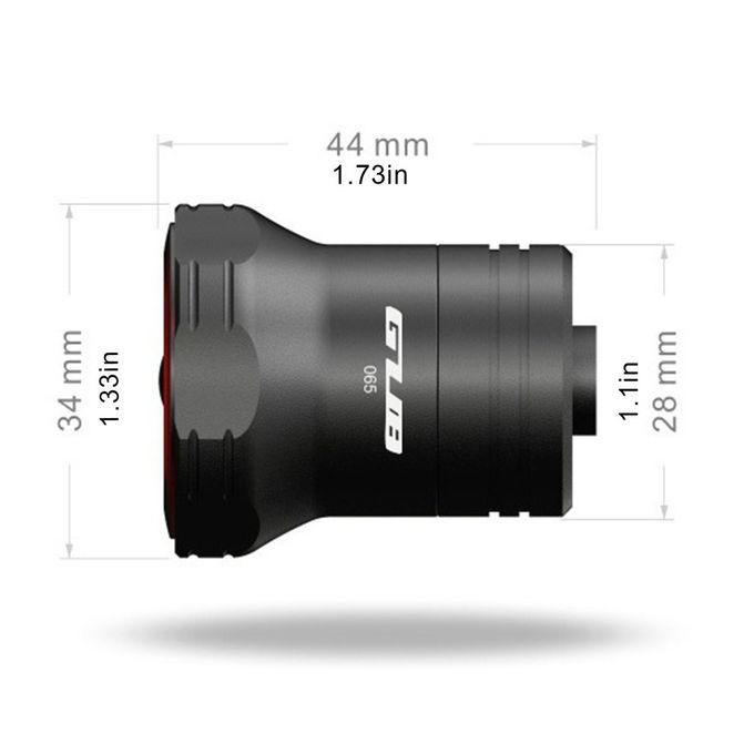 Spe ifi ations: Fun tion: Speed sensitive warning tail light Material: Aluminum alloy, ABS/P Working mode: automati mode / manual mode Installation method: seat tube/ ushion Light mode: steady light/breathing flash/slow flash/fast flash/rhythm flash/E O flash harging input: 5V-280mAh harging time: about 2 hours and 20 minutes Battery: polymer battery, 420mAh/1.554Wh, 3.7V Waterproof level: IPX6 onstant brightness: 46 lumens olour: Bla k Front diameter: 34mm Rear diameter: 28mm Length: 44mm