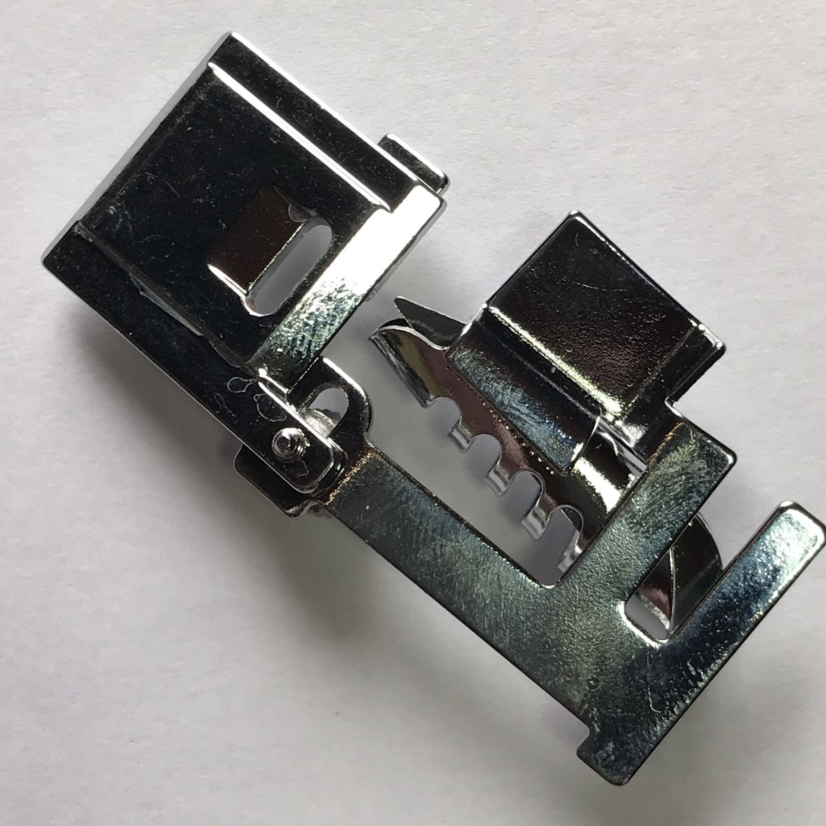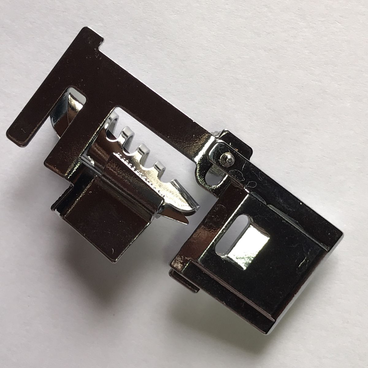 The foot is fitted with two grooves that folds the bias tape in bias form. It is also fitted with main fabric channel that allows you feed the main fabric edge into the foot while attaching the bias into the edge of the fabric.