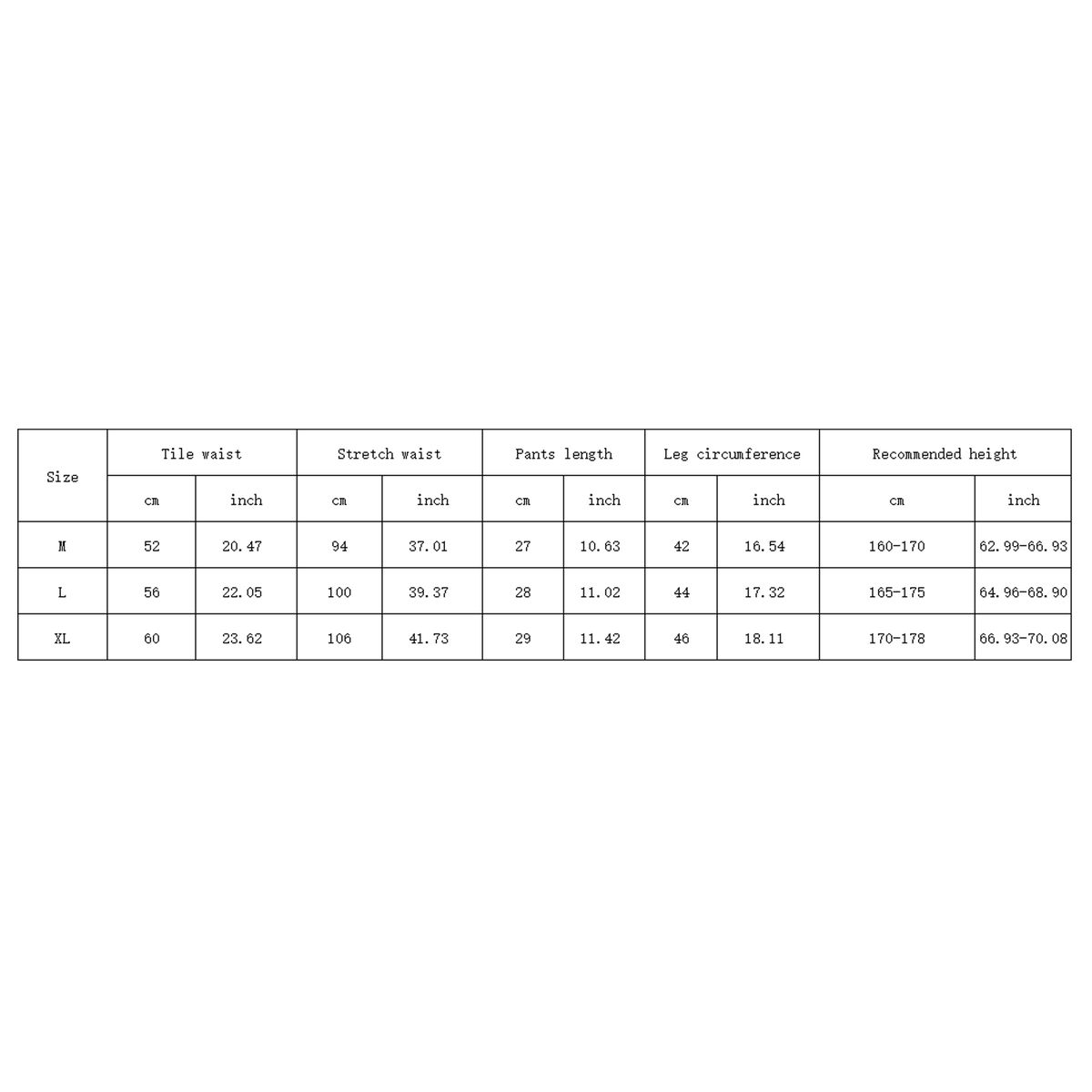 L (cm / inch)Tile waist: 56/22.05, Stretch waist: 100/39.37, Pants length: 28/11.02, Leg circumference: 44/17.32, Recommended height: