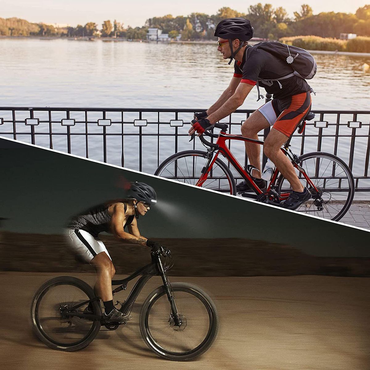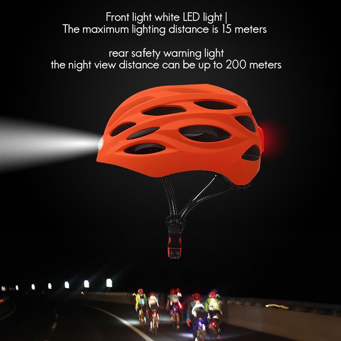 Safety rear light and illuminated front light: the rear light is designed for the safety of the cyclist and has 3 flashing modes (normal on/fast flashing / breathing). The visible distance of the rear light at night can reach 200 metres. The headlight can be used for lighting. The headlight has 3 white LED lights and the maximum beam distance is 15 metres.