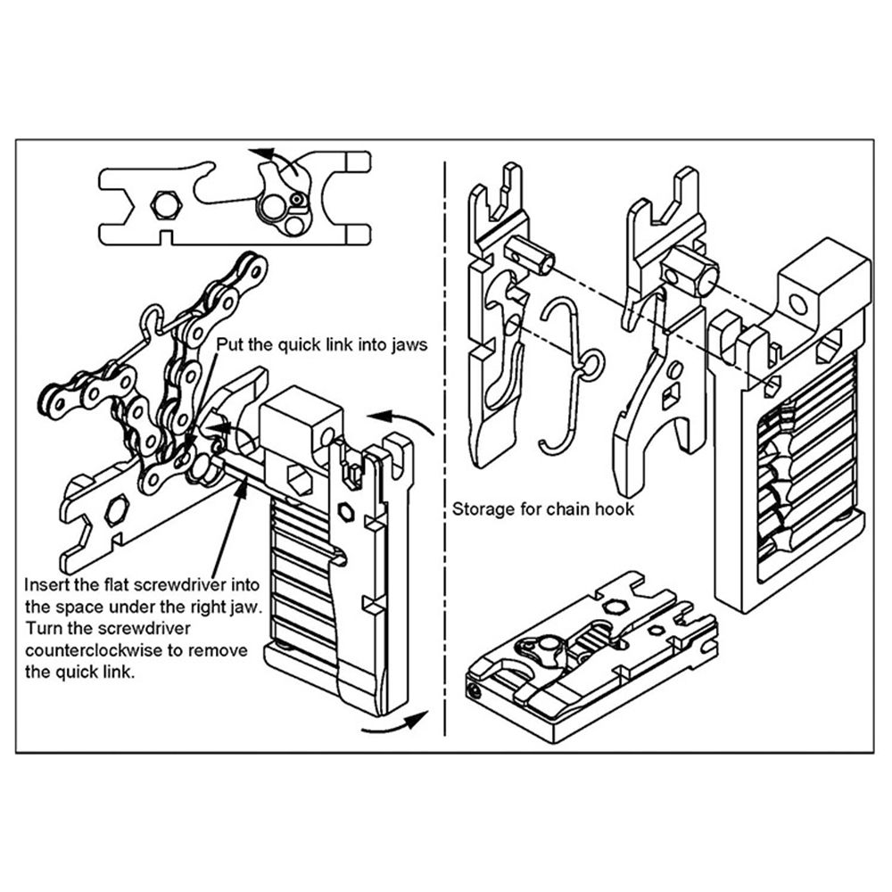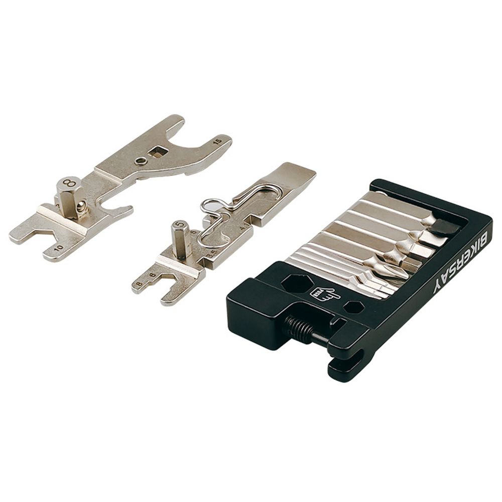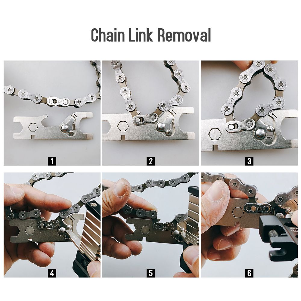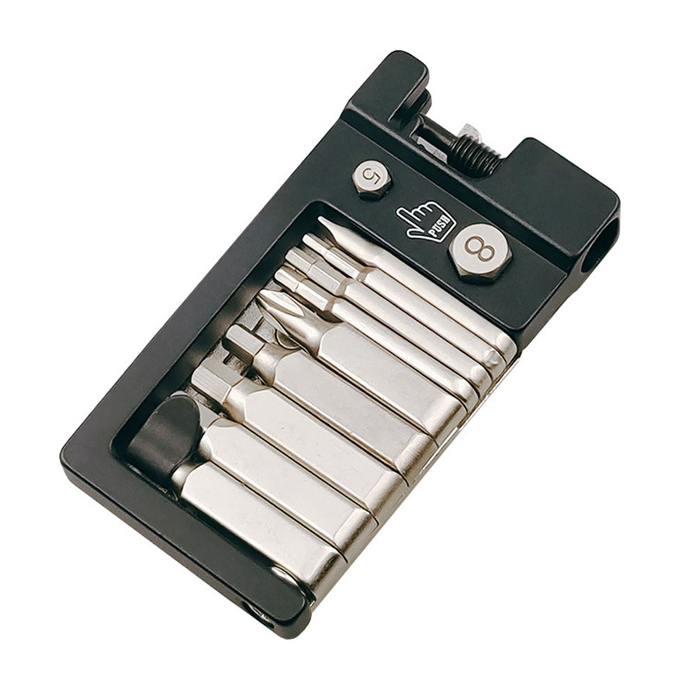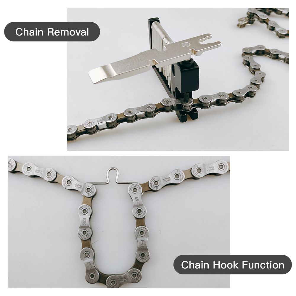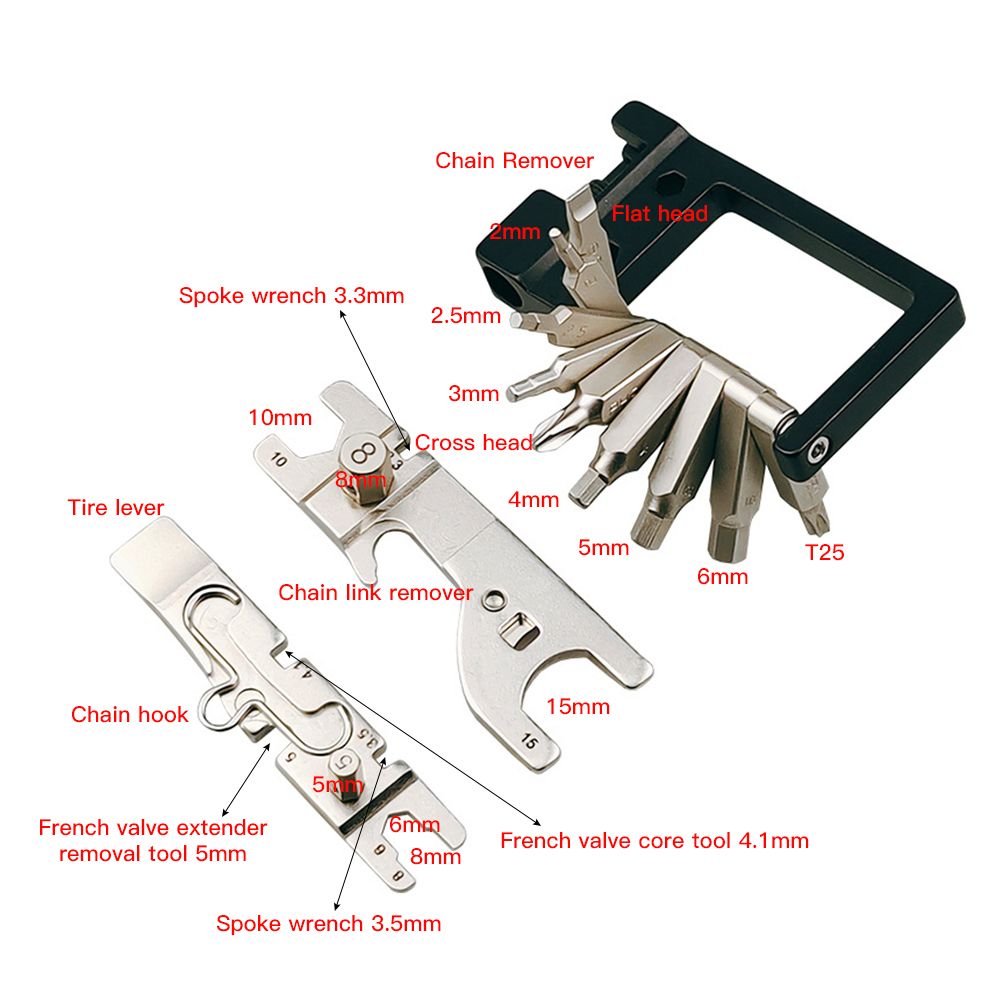 Multi-tools design: 2/2.5/3/4/5/6/8mm hex key, cross head ph2 /flat head, T25 driver, chain remover, chain link remover, 3.3/3.5mm spoke wrench, 6/8/10/15mm open spanner, tire lever, 4.1mm French valve core tool, 5mm French valve extender removal tool, chain hook.