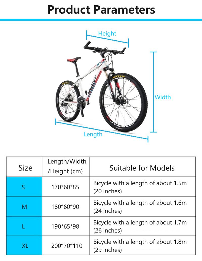 Origin : CN(Origin) Model Number : Bicycle Protective Gear Color : Silver Weight : 340g Size : XL Feature 1 : Bike Rain Dust Cover Feature 2 : Bike UV Dust Protector Rain Cover Description: PERFECT DESIGN: Double-stitched hems with heat seamed sealing prevent water from leaking through the sewing. Easily covers the entire bike including wheels. DURABLE PROTECTION: High density and durability 190T nylon material and PU coating, repel water and 40+ UV resistant, protected your bicycle against rain, snow, dust, wind, sun damage and scratches. Keep your bike like new for a long time. SECURITY FEATURES: Security eyelets at the front, enabling cover to be locked to bike via front wheel. Storm strap situated at the rear, to keep the cover in place during windy days. EASY TO USE: Achieving a tight fit is effortless with the elastic bottom hems. Elasticated hem to keep it from blocking off. Designed for both indoor and outdoor. CONVENIENT STORAGE: Drawstring waterproof bag included for easy storage. It is easy to pack up and transport with you, as well, making it an ideal tool for trip. Package Included: 1*BIKE COVER 1*STORAGE BAG