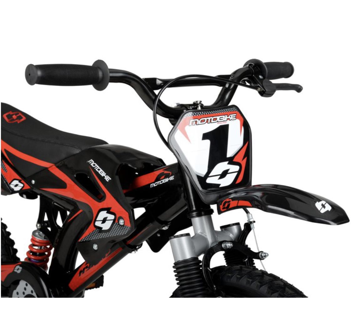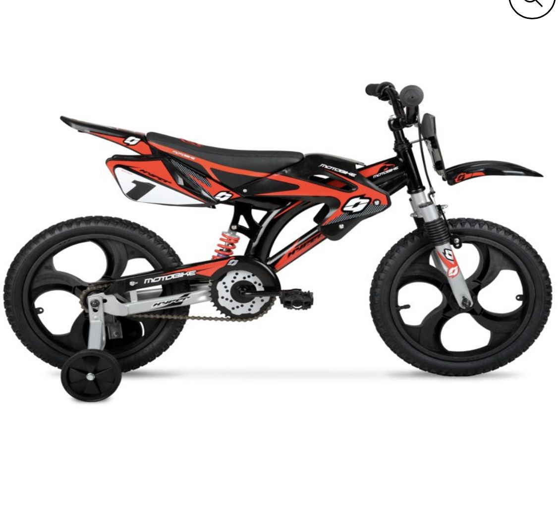 The Hyper Mag Wheel Motobike is the unforgettable children's bicycle. With hi-impact mag wheels, authentic Hyper graphics, fenders, and a cool superbike-style saddle, this is the coolest kids bike to hit the streets. It's built with a sturdy steel over-sized frame, steel handlebar, 16-inch rims, removable training wheels, and knobby tires. Standard size pedals and front brakes ensure an easy way to stop. Being a single speed bike, there are no complicated gears to maintain or untangle. It's easy to assemble and has a max rider weight of 100 pounds. It's fully loaded with everything they'll need to get around safe and in style.
