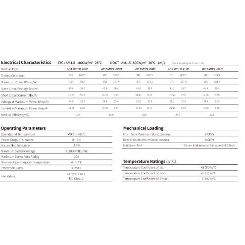 STC: 1000W/m2 irradiance, 25 centigrade cell temperature,AM1.5g spectrum according to EN 60904-3.Average relative efficiency reduction of 5% at 200W/m2 according to EN 60904-1.
