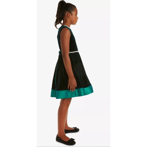 This knee length dress is made of the best grade of cotton material. it is sleeveless with low round neck. the waist line is adorned with embroidery lace and drop thread in color. it has touch of royal blue, print green and orange. the colors are printed with design at makes its attractive, it is devoid color riot. it has a royal belt to make it firm. it has inivisible zip behind. 140 is suitable for (3-4yrs) 150 for (4-5yrs) 160 for(5-6yrs) 170 age (6-7yrs)