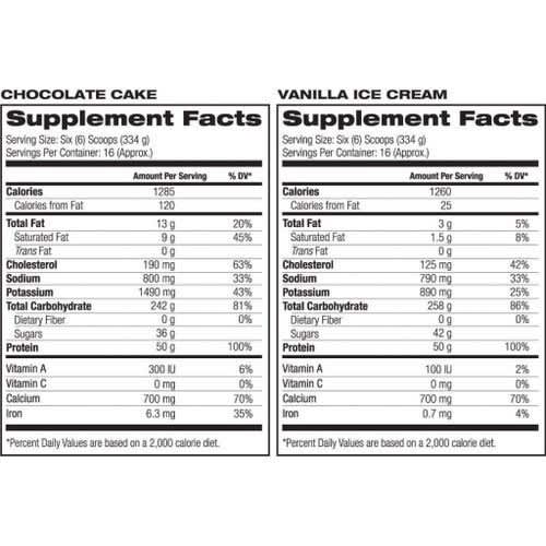 Scientifically formulated mass gainer contains 50g of high-quality protein, 1,340 nutrient-dense calories and 277g of carbohydrates per serving11g of BCAA to help with muscle recovery and growth and reduced muscle protein breakdown1g of creatine helps your muscles produce energy for exercise*^10g of the amino acid, glutamine, serving as fuel to help maintain immune health and muscle support*Gluten-free recipe with a natural and artificial vanilla ice cream flavorEasily mixes into your favorite shake or blend7.14 lb. container