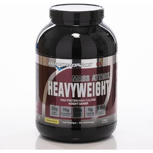 MASS ATTACK HEAVYWEIGHT IS A HIGH CALORIE VERSION OF THE POPULAR MASS ATTACK FAMILY.Some people have a very fast metabolism, which means it is physically very difficult to eat enough without feeling sick or bloated in order to gain weight. Boditronics heavyweight is specifically designed for "hard gainers" or & ldquo;mass gainers & rdquo;.Containing a massive 60g of muscle-building protein, together with quality complex carbohydrates and medium-chain triglycerides (a fat that is processed in the body like a carbohydrate), Boditronics Mass Attack Heavyweight mass gainer packs a monster 1300 calories per serving when mixed with water (more if mixed with milk).In addition, Boditronics mass attack heavyweight 6kg, mass gainer contains the heavyweight gain stack, a precise mix of Creatine monohydrate and dextrose monohydrate designed to transport Creatine to the muscles quickly and efficiently. Continued supplementation with Creatine has been shown to increase power, muscle size and strength.Unlike most high-calorie , Boditronics Mass Attack Heavyweight mixes easily in a shaker and is not overly thick, making it easy to consume. Available in delicious flavours, Mass Attack Heavyweight contains no artificial colours, flavours or preservatives and is unique in that it also does not contain any artificial sweeteners.