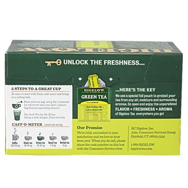 A citrus-y hint of lemon is added. The tea bags are then wrapped in protective pouches to seal in freshness. What more can you ask for, a product that contains antioxidants and tastes great. So go ahead, enjoy a cup or two or three throughout your busy day. Bigelow Green Tea with Lemon, drink it once and discover a whole new dimension in green tea enjoyment. Blended and packed in the USA.