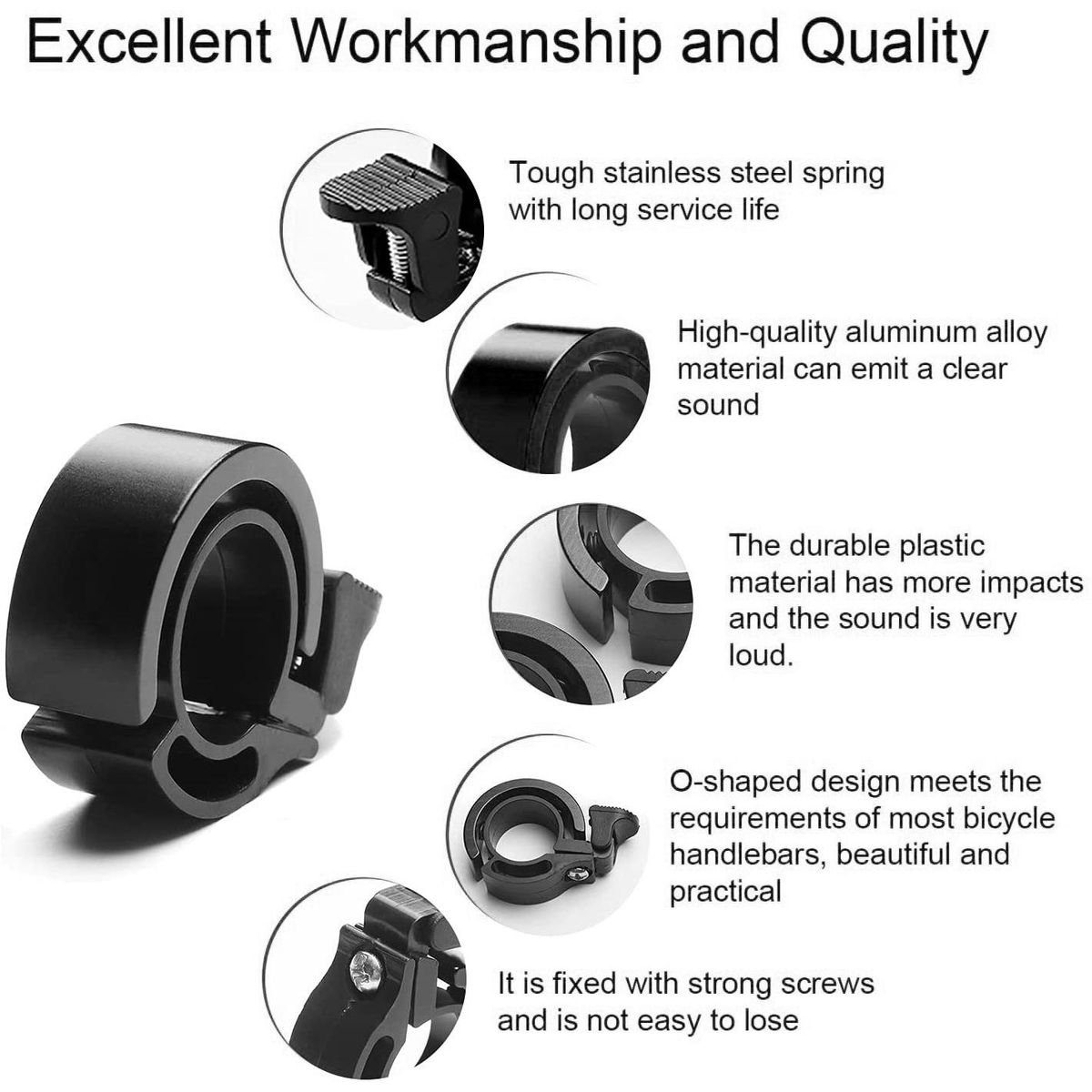 CRISP AND LOUD SOUND: The highly elastic spring of this bike bell can increase the force of the strike and produce a crisp sound of up to approximately 100Db. And the unique arc-shaped design of this bicycle bell allows sound to travel 180 degrees. You can be clearly heard by pedestrians and passing vehicles when riding on noisy roads or in the dark.