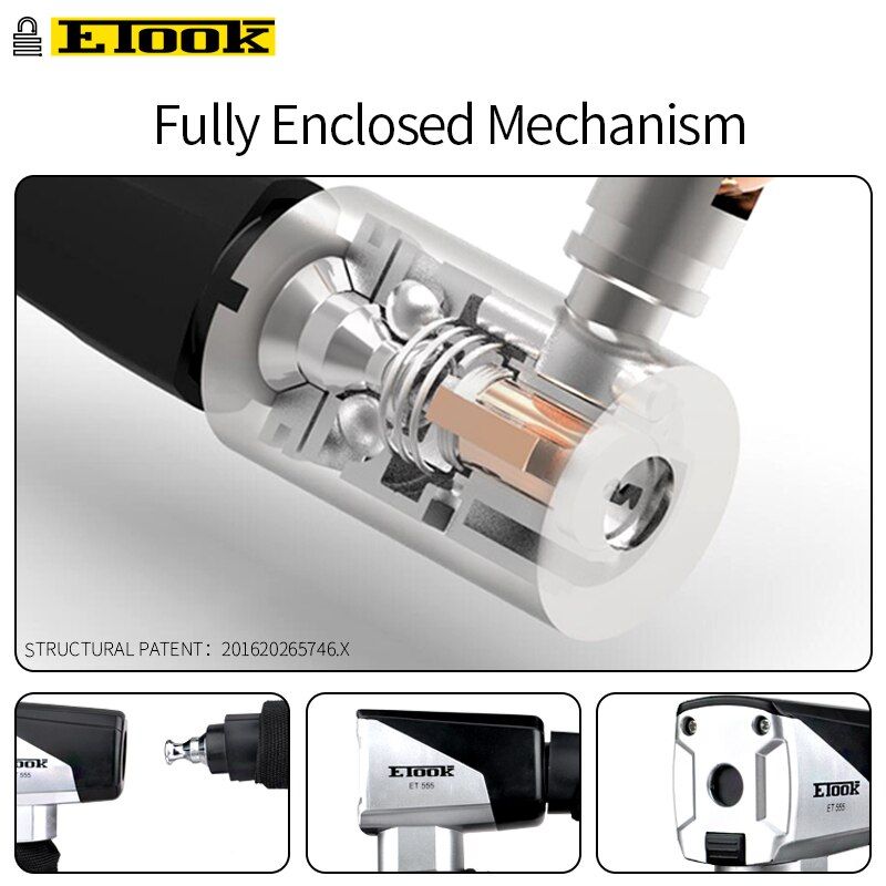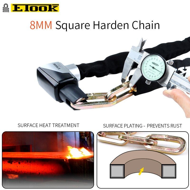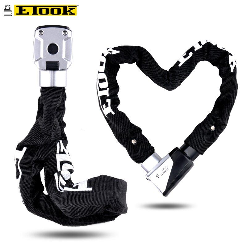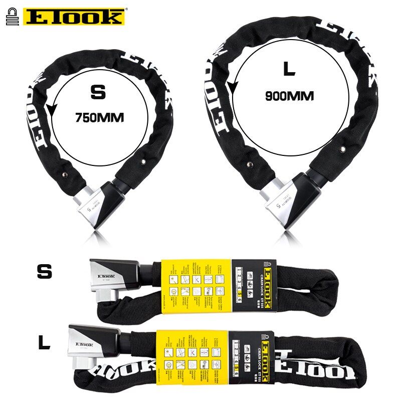 Product Information Product Brand: ETOOK Product Name: Bike Chain Lock Size: S: 75cm L: 90cm XL: 110cm Weight: S:1430g L:1630g XL: 1830g Material of lock: Special steel alloy Key: Copper-nickel alloy Security level: Level 5- (long period in the night, against professional thief) Attached: Two keys Product Features 1.The lock cylinder with advanced Switzeand technology, the thickness of the key is only 0.3-0.6 mm, which avoid the key copied effectively. 2.Hard special steel material with heat treatment, strong and high toughness, no chance for being thumped, sawed, sheared and drilled. 3. High-end, functional, long-life fabric sleeve to prevent from damage to the bicycle's paintwork. 4.With anti-drilling cap, prevent the electric drilling from dam the lock cylinder. 5.With waterproof and dust proof cap to protect the lock cylinder.