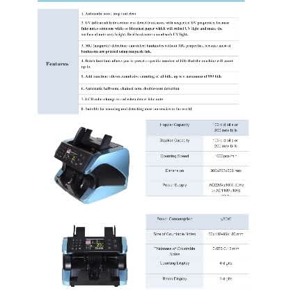 features-automatic detecting with uv (ultraviolet) and MG(magnetic)IR(infrared radiation)while counting-suitable for money-Automatic start,stop and clearing-with batching,adding and self-examination function-automatic half-note detectionType: Money CounterCounting Speed: 900 pcs/MinBank Note Size: Max: 90 x 185 mm, Min: 50 x 100 mmSize of Package: 320 x 288 x 205 mmNet Weight: 5.7 KgGross Weight: 7.0 KgColor: Multi ColorCounting Display: LED DisplayPower Consumption: 80 WDisplay is LED. UV, MG, IR detection technology.