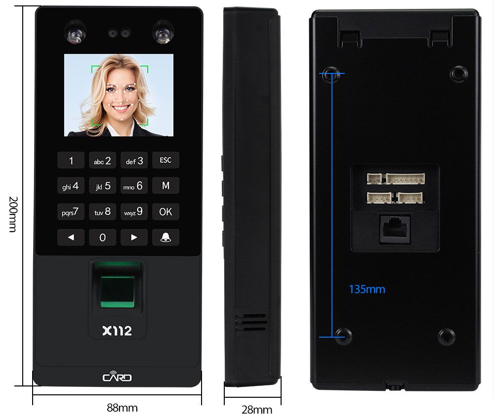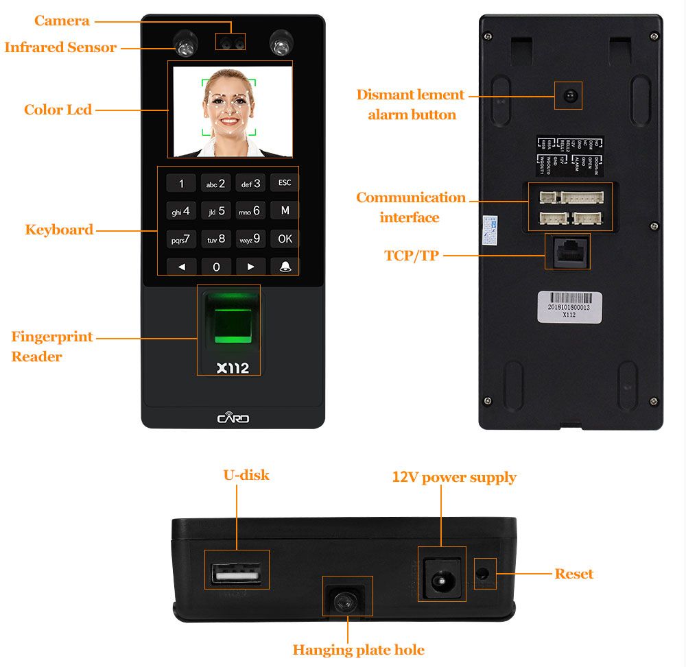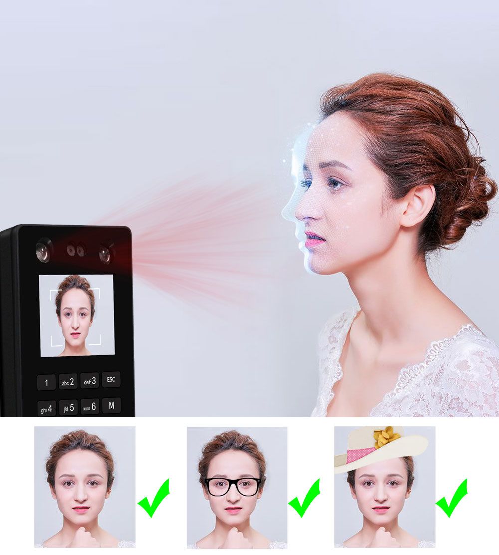 Features:1. 2.8inch TFT Color screen.2. Strictly follow the national security product standard.3. Face recognitio with its high-resolution infrared night vision light and professional color duo camera, the terminal can carry out quick verification in any environment.4. The Energy-saving fingerprint sensor and power management function, makes the product perfect.5. Support 500 facial ,1500 fingerprints, 500 password, 500pcs R-F-I-D card user capacity, 60000 record capacity6. Supports face, fingerprint, password, R-F-I-D card and various combination methods, in order to satisfy the demands of different users.7. T9 input method editors, on the machine name, Department, frequency and other information, can be directly output attendance reports, user operation is simple8. Support TCP/ IP communication method. Support USB Flash drive upload download.9. Has Wiegand 26/34 input/output, TTL input/output, relay output, door bell button.10. Humanized language indication reminder.11. Support Chinese language, Traditional Chinese, English, Spanish, Korean, Japanese, Turkish, Indonesian, Italian, Thai.12. Suitable for the entrances and exits of office, factory, hotel, school, etc.