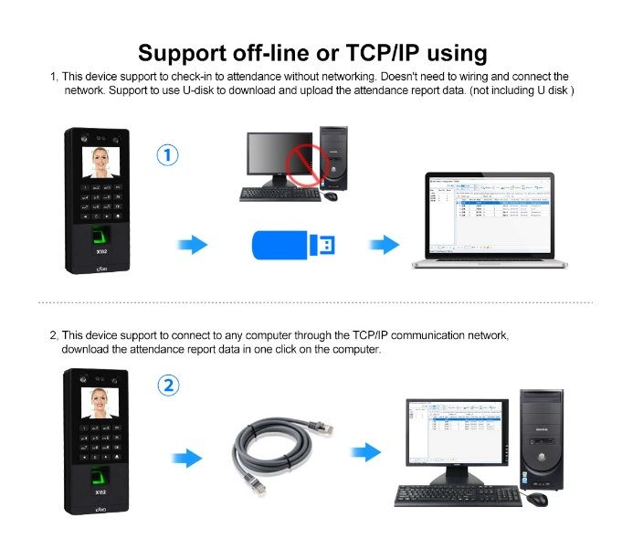 This device support to connect to any computer through the TCP/IP communication network. Supports to download the attendance report data in one click on the computer directly. And also supports to use U-disk to download and upload. Please noted only the model X112 and X112-K with this function. And there is no U-disk included in package.