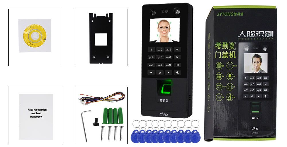 1 x X112-K Facial Fingerprint Recognition Machine1 x CD disk (Including software for Windows only)1 x Bracket1 x Screws & Wires10 x R-F-I-D keyfobs1 x User Manual