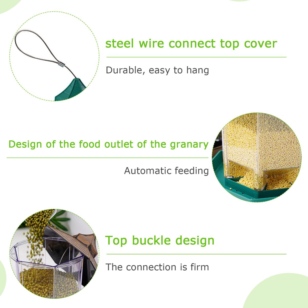 Easy to Clean and Disassemble: The roof is provided with an inverted buckle slot, which is convenient to add grain and clean. It is waterproof and sheds the sun.