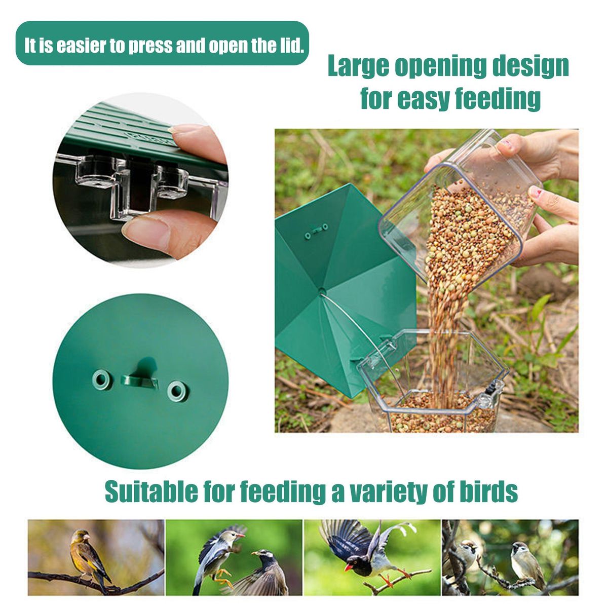 A bird feeder adopts transparent design, so as to check the surplus grain and replenish it in time. It has a large capacity and can hold enough food to feed birds.