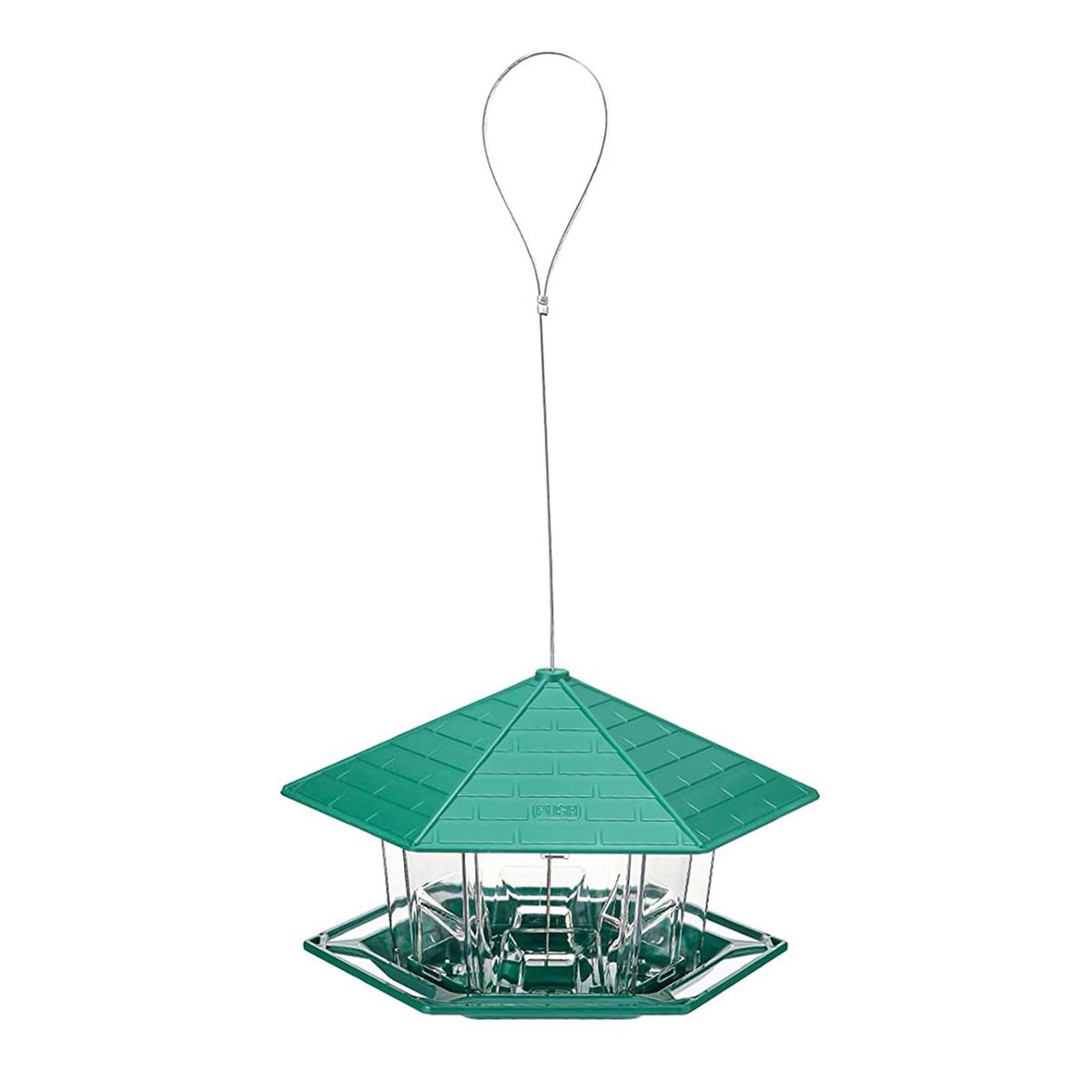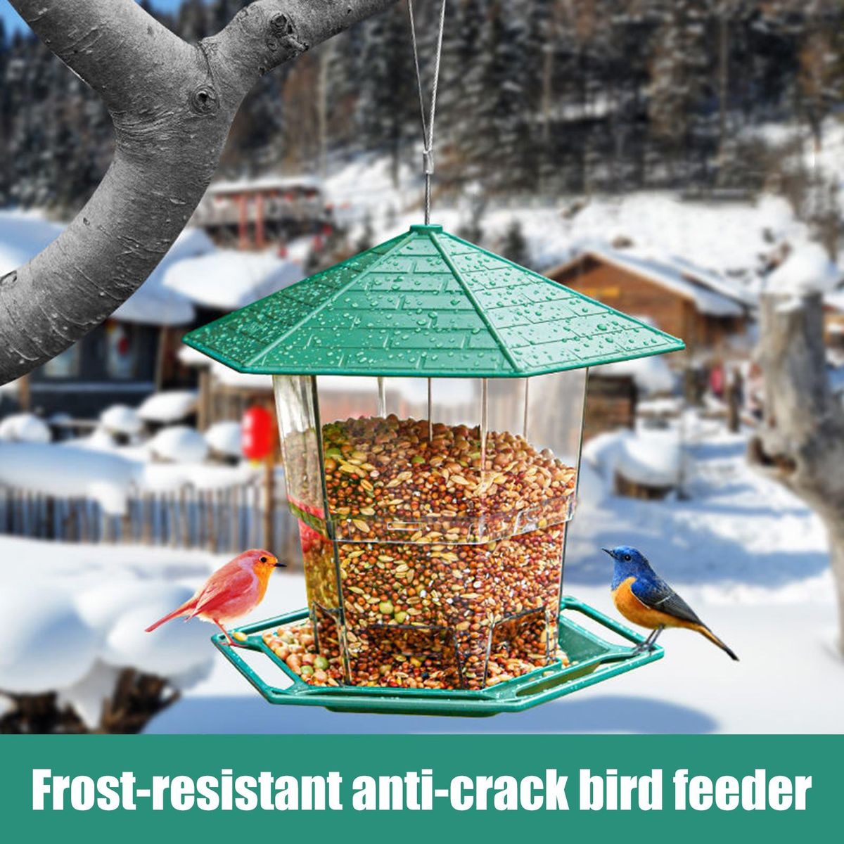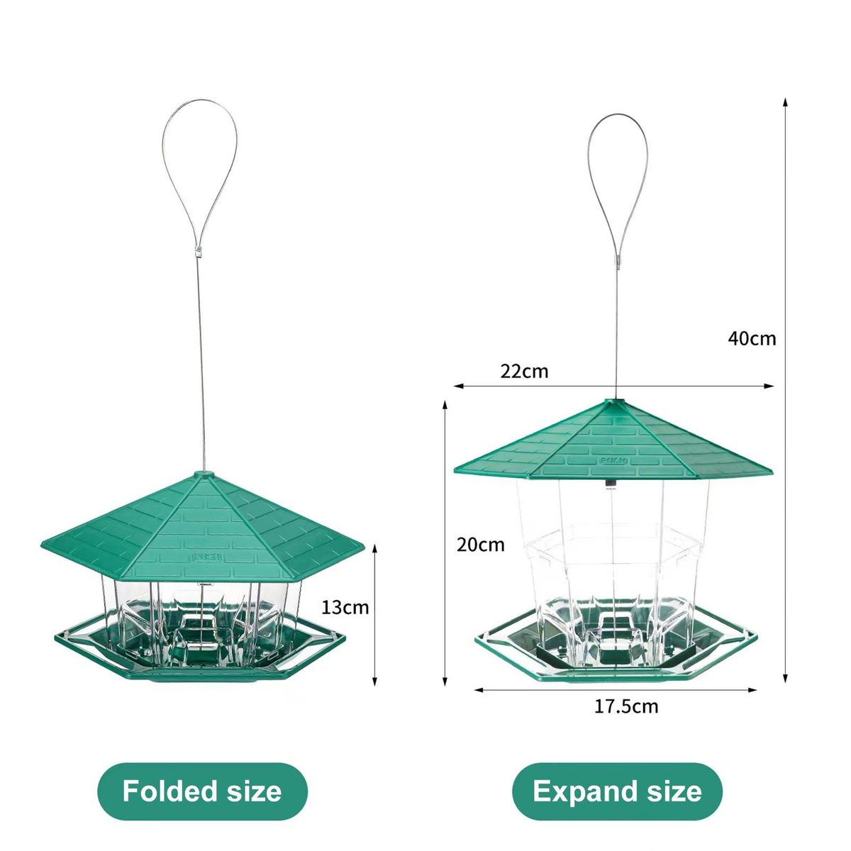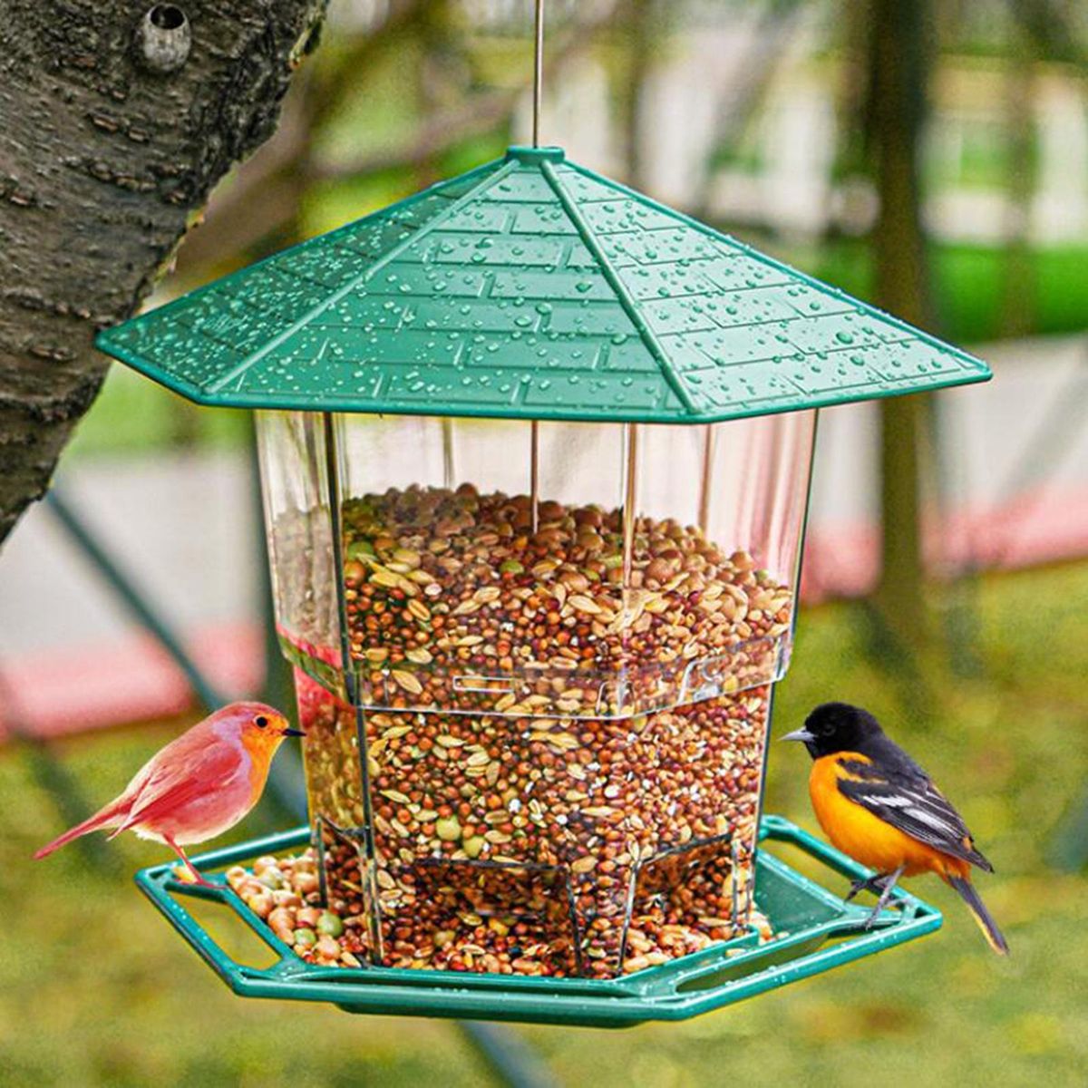 Bird feeder has water leakage holes to prevent water accumulation. They adopt a hexagonal roof design, and the roof is inclined to prevent grain from getting wet.