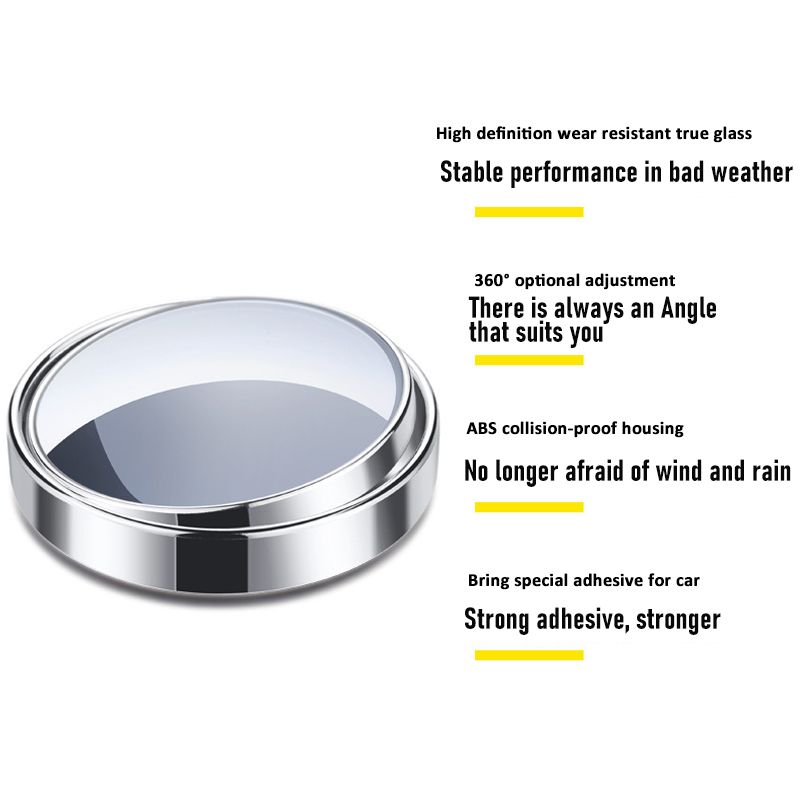 Description: This product is made of high quality ABS shell and high quality lens. The edge treatment of the lens is beautiful and high-quality, and the field of vision is wider. Double-sided tape is ed double-sided tape, which is firm in viscosity and long in service life. Anti-collision design, 360° rotation, away from blind spots. ABS anti-collision shell, silver plated proce. Super , more sturdy. Gla mirror, HD wearable, clear and durable. Product : Item:Car Auxiliary Mirror Size: mirror diameter 5 cm Material: lens, plastic Anti-collision design, 360° rotation, away from blind spots. ABS anti-collision shell, silver plated proce. Super , more sturdy. Gla mirror, HD wearable, clear and durable. Color: black, Package includes: 2pcs small round mirror