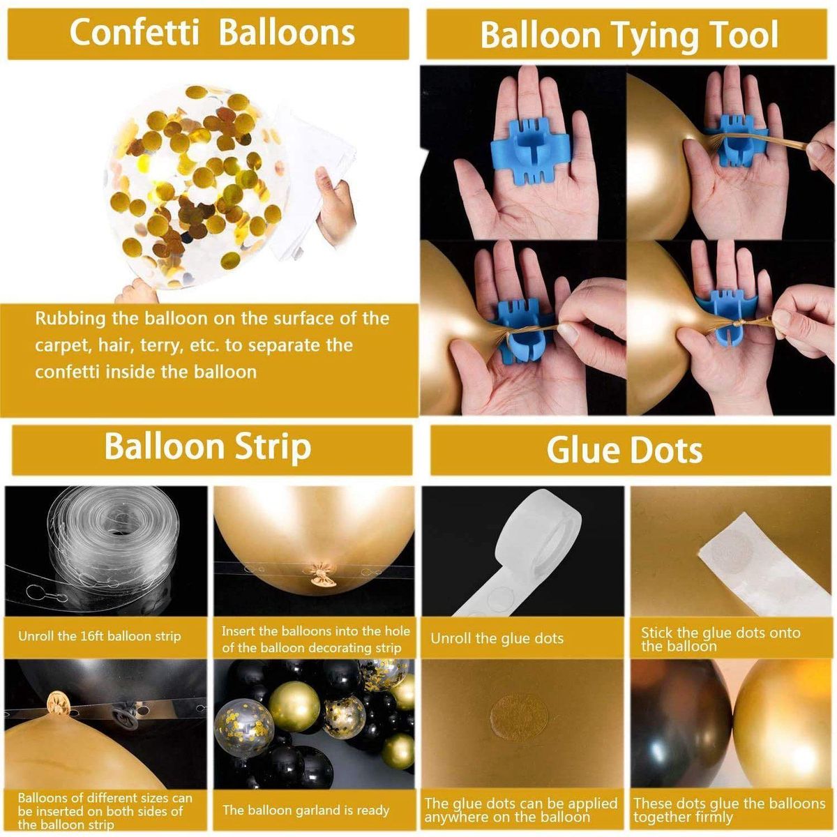 Easy to use: Balloon tie tool helps tying balloons easy, faster and painless on finger. Insert balloons into the holes on the tape or put into grooves on clips. It will not fall out with a set of holes. Simply peel button off adhesive sheet and stick on the aim. You should allow 60-90 minutes to complete your custom garland. You can inflate balloons 1 day prior to your event.