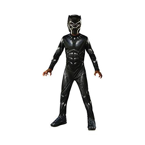 Child's officially licensed black Panther movie costume includes printed black and grey jumpsuit with attached shoe covers, and mask. Important! costumes are sized differently than apparel, use the Rubie's child size chart, do not select size based on age or clothing size. Black Panther and his fellow Marvel superheroes are available in child and adult sizes, great for a fun Group or family costume.