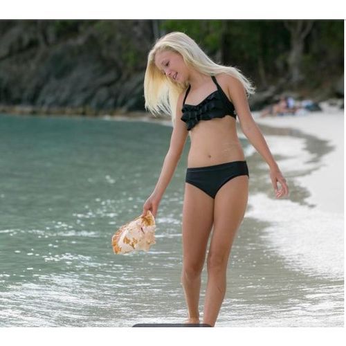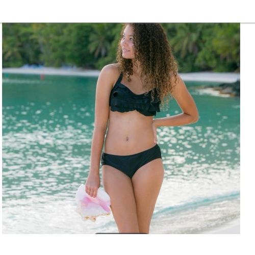 Our answer to the little black dress--a high-quality, flattering black bikini. Our Sea Wave style has three layers of ruffles across the bust, is fully lined and includes molded cup liners. With ties at the neck and back you're sure to get a great fit that will support you and provide modest coverage