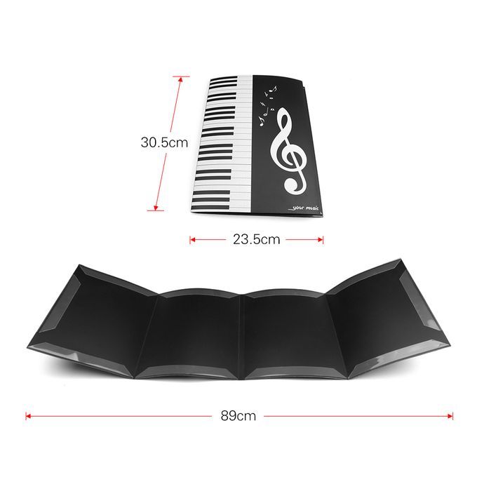 Able to hold A4 size music sheet, and can contain 6 pages at most. The length at fully unfolding is about 89cm.