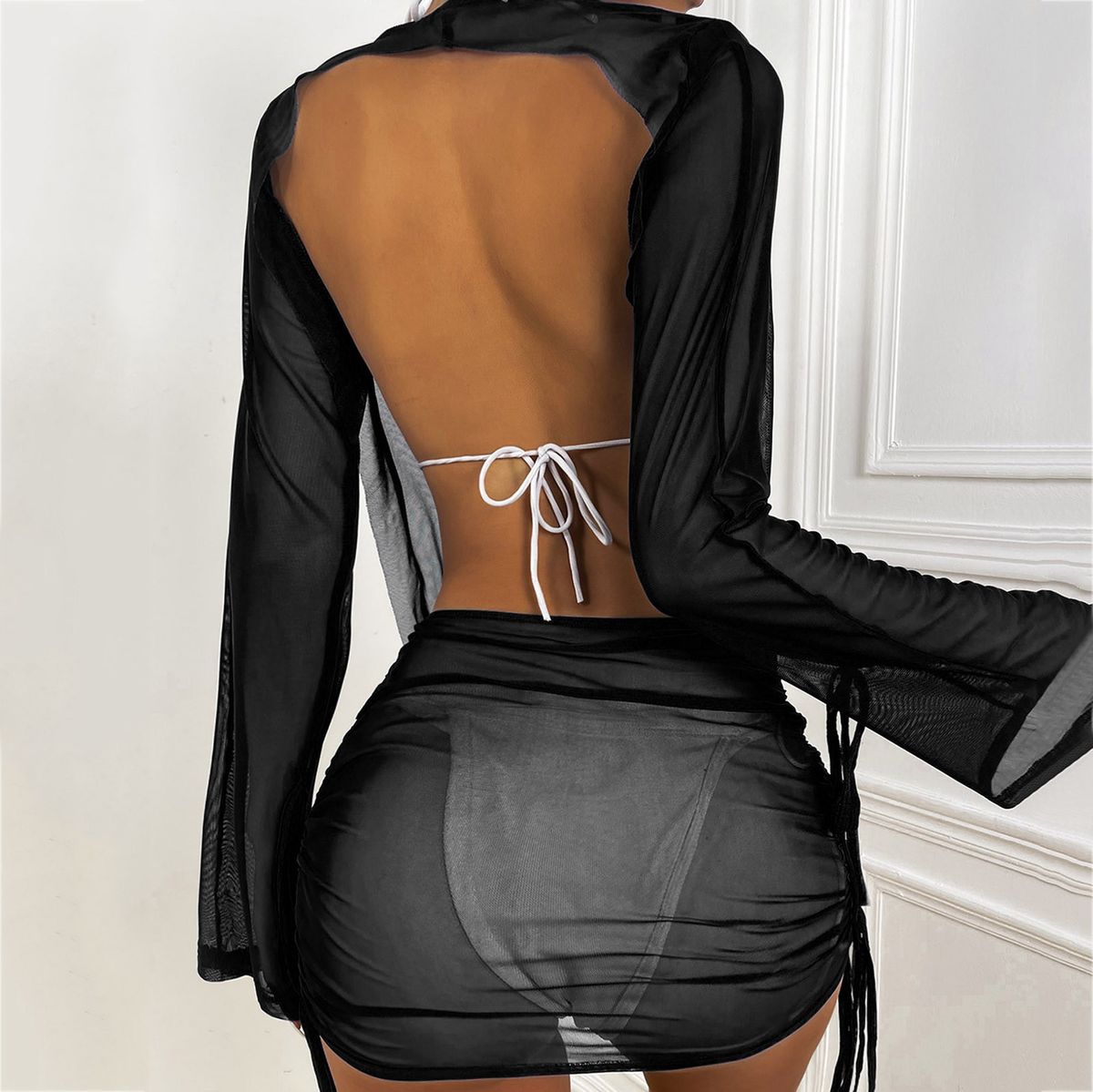 Women Summer Bikini Cover Up Sexy Draped Front Drawstring Knot Backless Mesh Swimwear Mini Dress Ladies Wraps Beach Bathing Suit