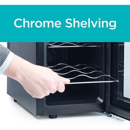 This phenomenal BLACK+DECKER small wine cellar (9.7" x 19.8" x 14.9) stores up to 6 bottles of your favorite vino at just the right temperature. Preserve your wine so it will retain its delicious taste and nuanced flavors with our wine cooler (17.6 lbs.) that ranges in temperature from 46° to 65° Fahrenheit. Ideal for your favorite bottles, this thermoelectric cooling wine fridge small is energy efficient with very low vibration. Our digital wine cooler comes with a clear triple pane glass door, 2 chrome full-length racks and convenient interior light. This outstanding small wine fridge also comes with adjustable leveling legs, recessed door handle and is proudly ETL certified.