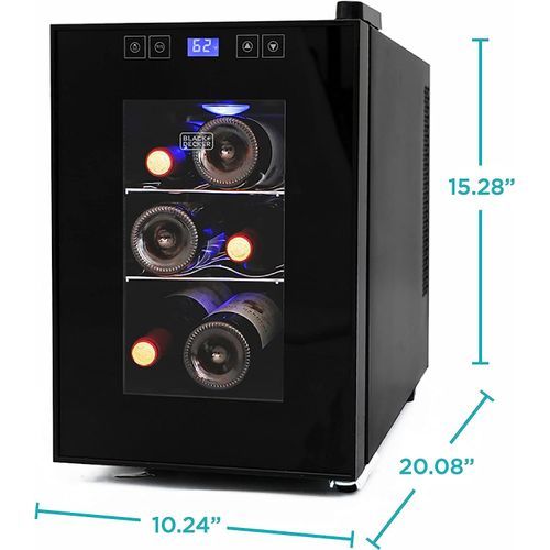 - 6 BOTTLE STORAGE: Store up to 6 bottles of your favorite vino with this 17.6-lb. space-saving small wine cellar. Our BLACK+DECKER small wine fridge (9.7" x 19.8" x 14.9") also includes 2 chrome full-length racks and convenient interior light.