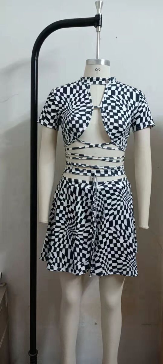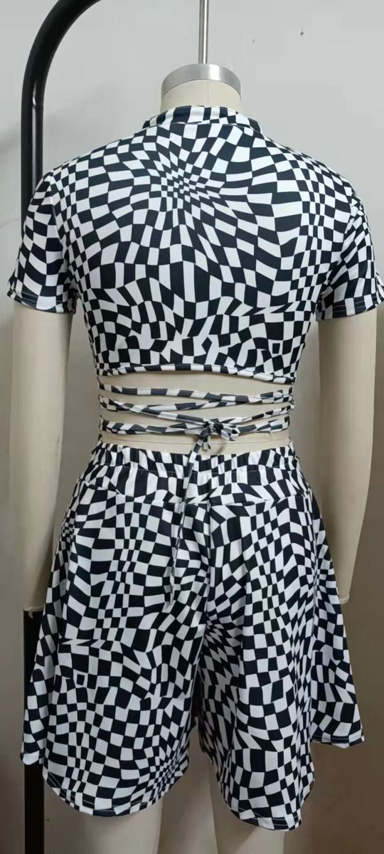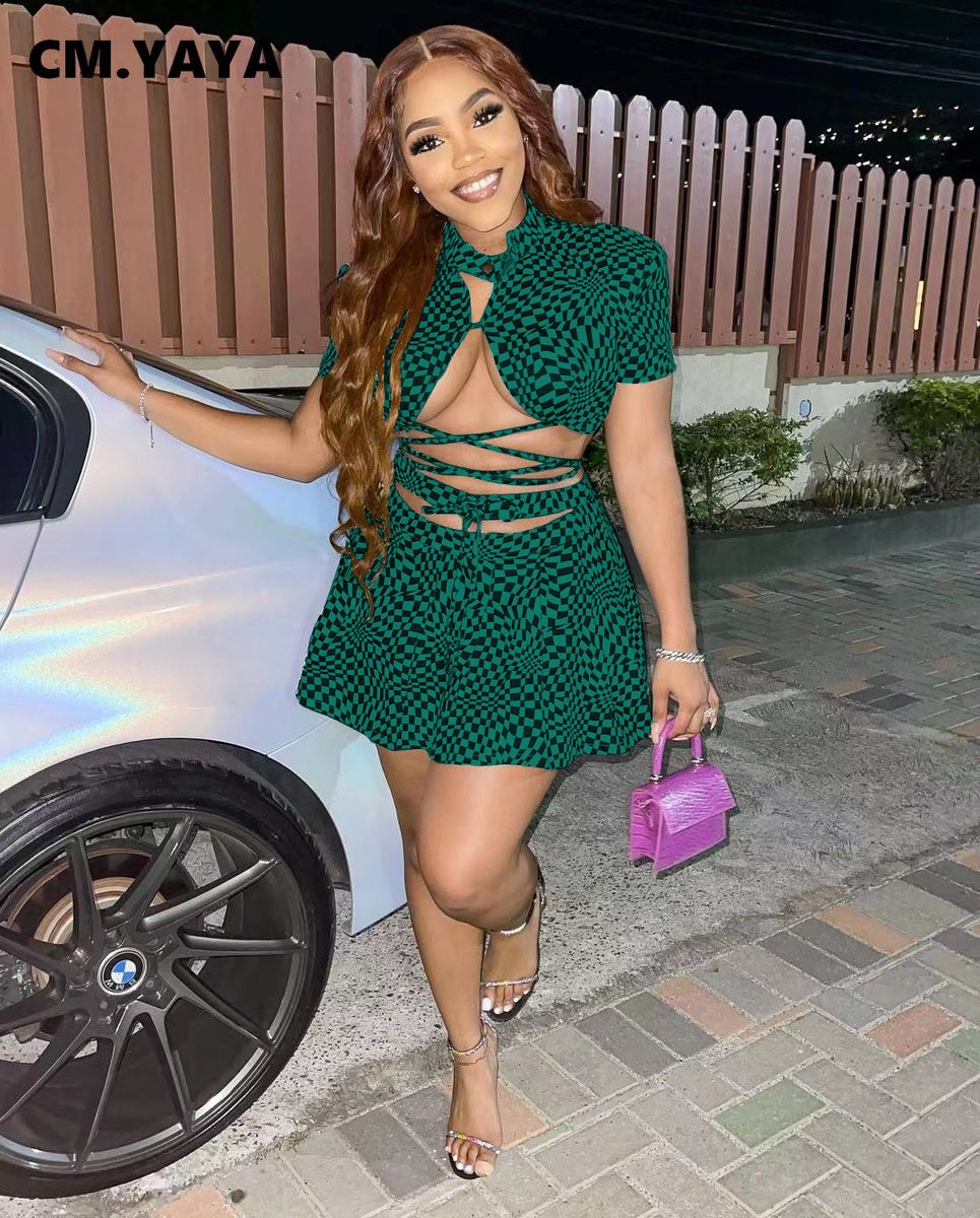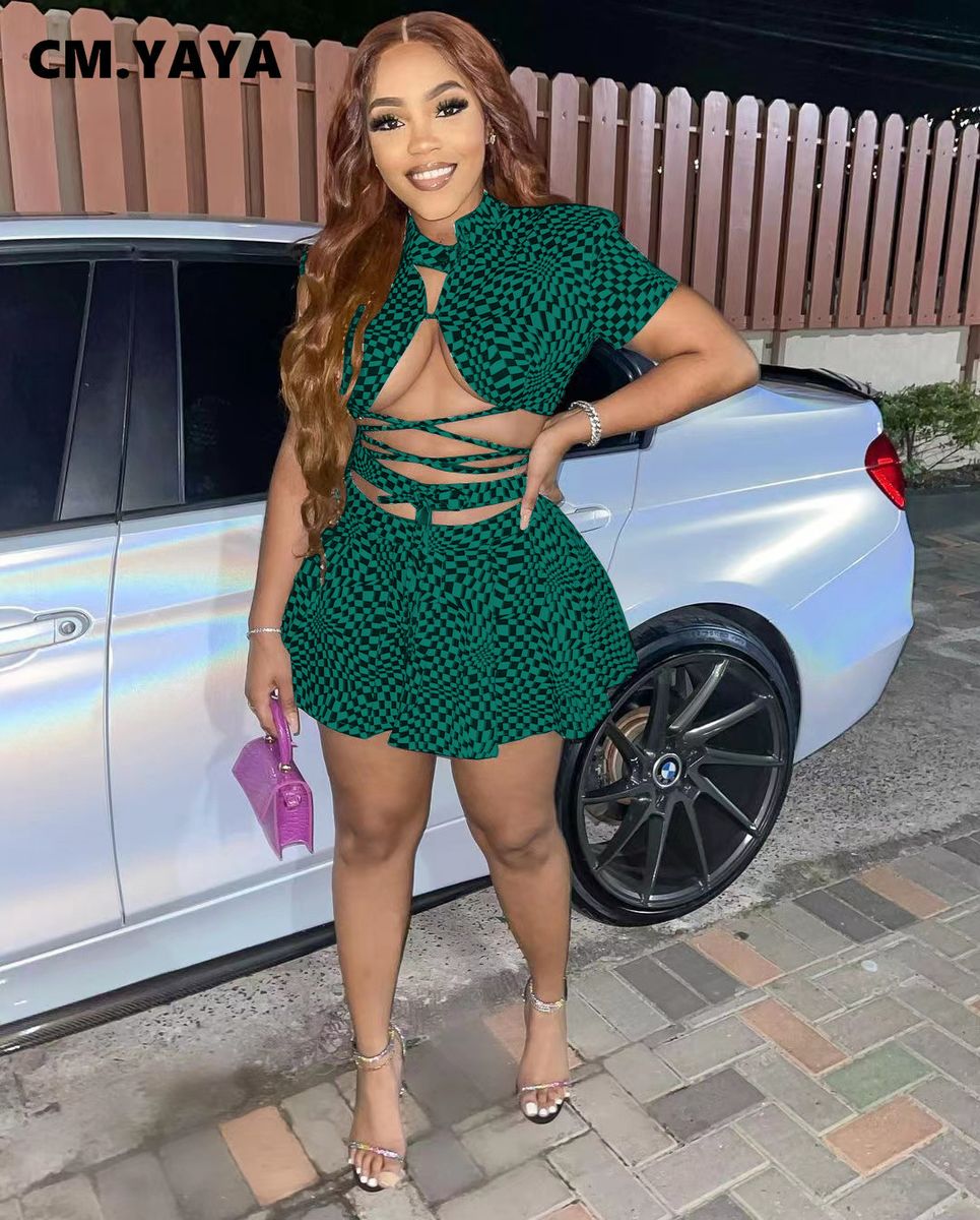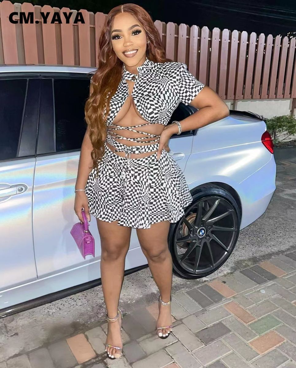 1X CM.YAYA Elegant Plaid Women's Set Lace Up Crop Top and Flare Pleated Shorts Beach Tracksuit Two 2 Piece Set Fitness Outfits