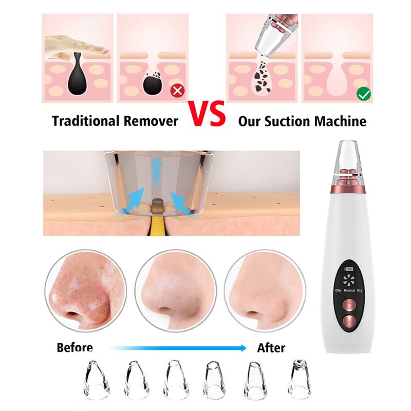 RECHARGEABLE BLACKHEAD REMOVER: Are you still having face problems with blackheads and enlarged pores? Then this blackhead remover will be your perfect choice. Five-gear adjustment, equipped with six suction heads, 5 in 1 pimple/ zit/ extractor tool, can remove blackheads, deep cleaning your skin.Features:1.Change the traditional blackhead suction method, vacuum-blackhead-suction device.
