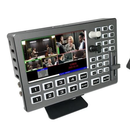 Similar to its predecessor the ATEM Mini, the ATEM Mini Pro from Blackmagic Design is a four-input live production switcher with an integrated control panel designed for multi-camera live streaming up to HD video to the internet or broadcast applications from gaming consoles, corporate computer streams, or HD cameras.