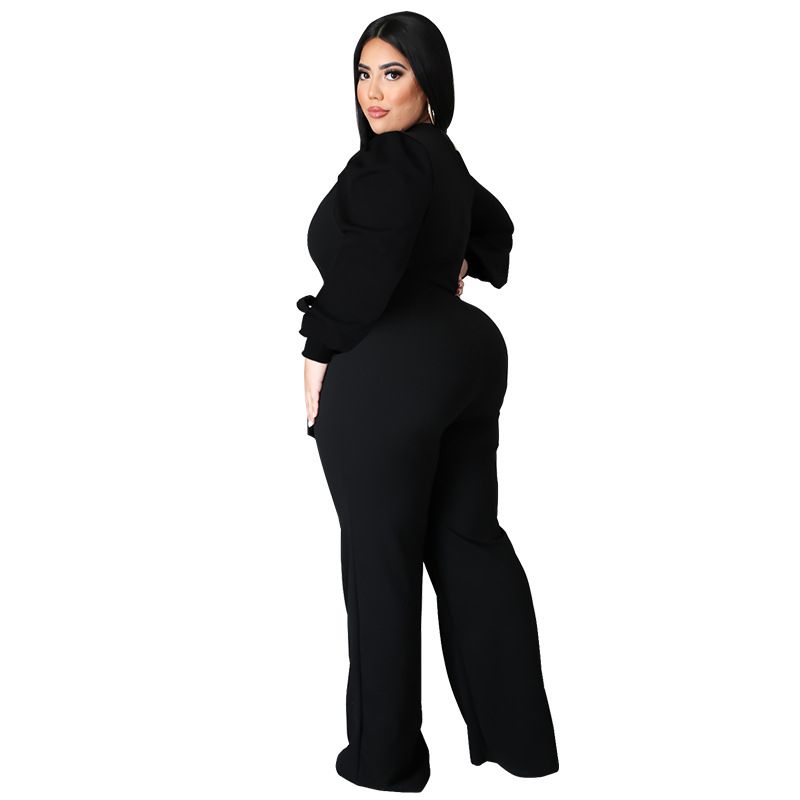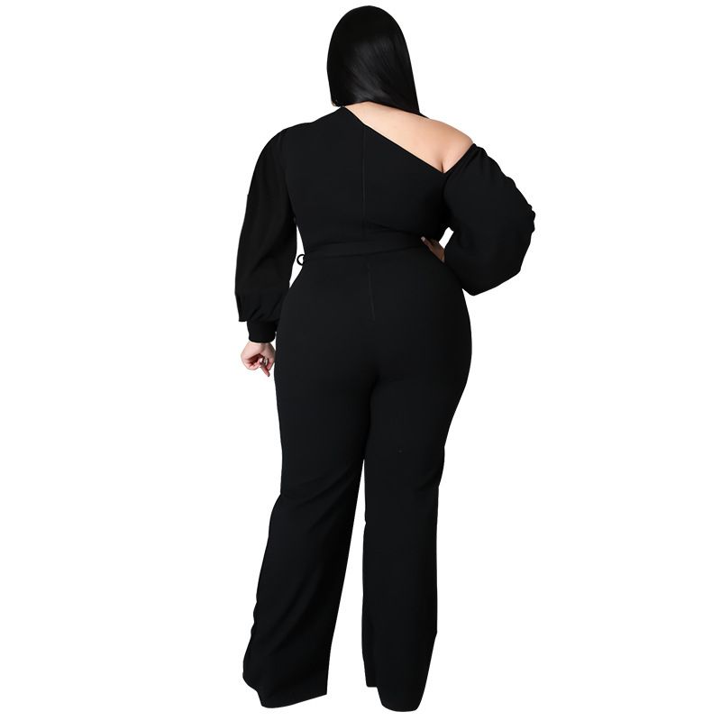 1X Plus Size Jumpsuit Women with Sashes Salsh Neck Solid Color Chic Lantern Sleeve Ladies Long Rompers Wholesale Dropshipping