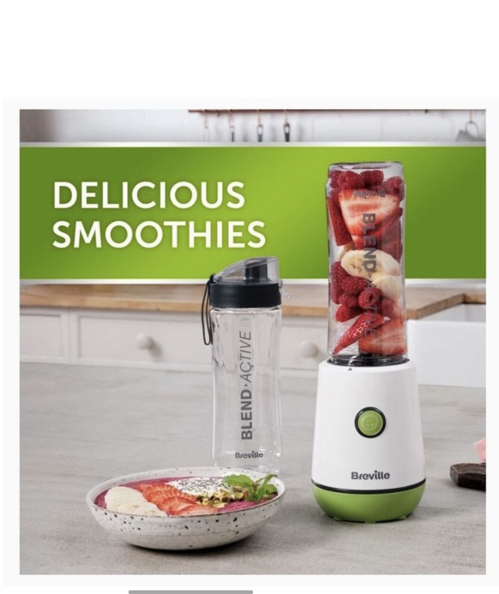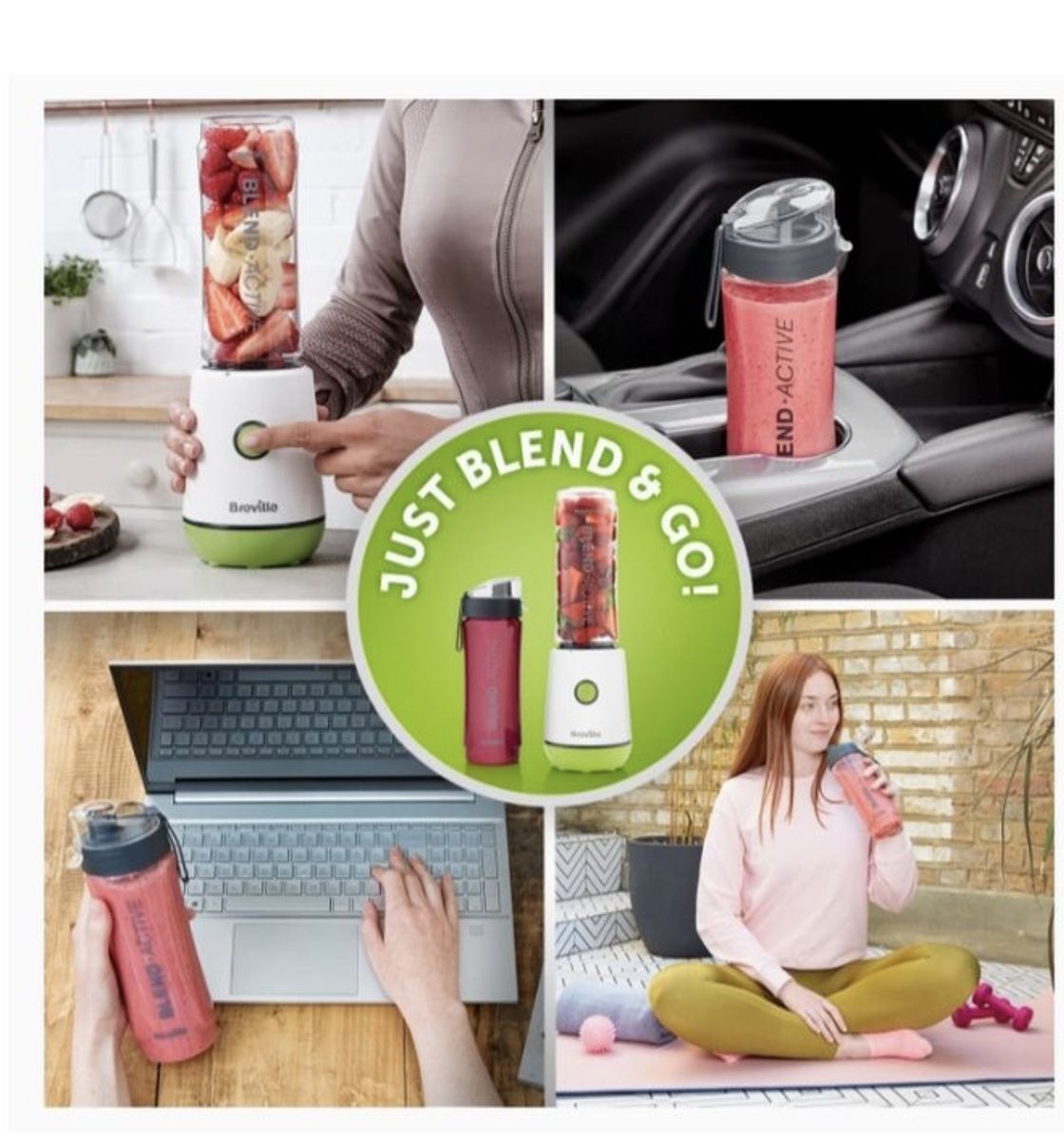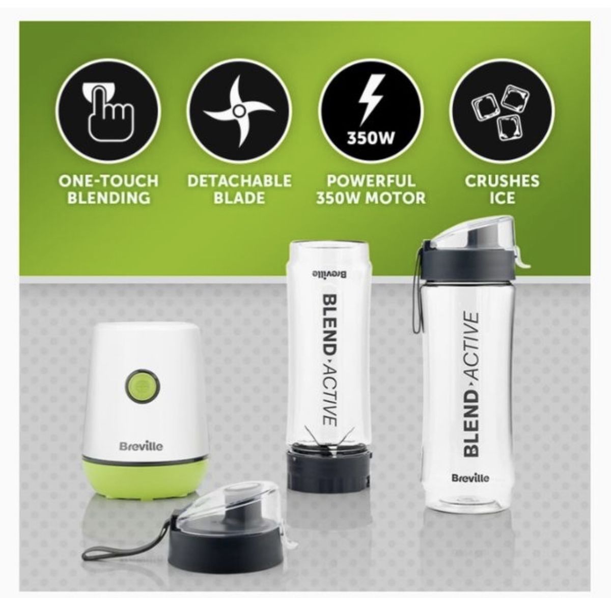 he Breville Blend-Active is an individual sized blender and stylish sports bottle, giving you one-person-portion fruit smoothies, breakfast drinks, protein and sports nutrition drinks and iced juices with just one touch of a button. Take your Blend-Active to work or the gym, or keep it with you in your home. Enjoy smoothies, juices, protein shakes and more on the go with the Breville Blend Active. This single-serve blender features a powerful 350W motor that smoothly blends frozen berries and ice with juice and other liquids. The blending occurs in the top of the bottle so nothing gathers in the base, while the one-touch action delivers perfect results in seconds; ideal for busy weekday mornings before you head out to work, school or the gym.