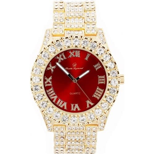 This watch is a super flashy, highly polished, 14k gold plated, ice stunned wristwatch with roman numeral iced out. This product was made to fit your flashy outfit or rich wear.Truly made into a masterpiece, crystal studded watch is customized to the fullest. Round watch in silver tone finish, featuring 28 white crystals at bezel. Its Unique Round Watch Case is inspired by what all rappers are wearing!!