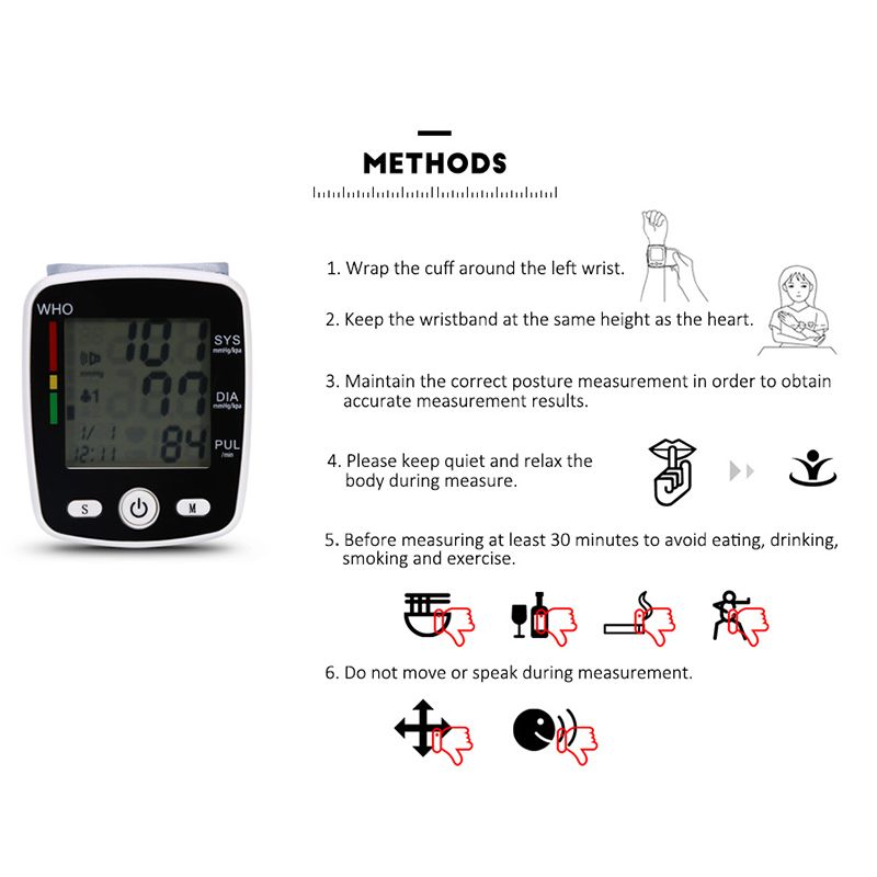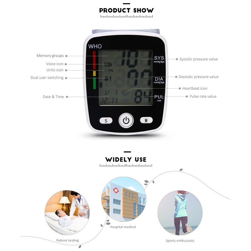 Blood Preure Monitor Digital Wrist Pulse Heart Beat Rate Meter Device Portable Tonometer BP Sphygmomanometer Home Health Care