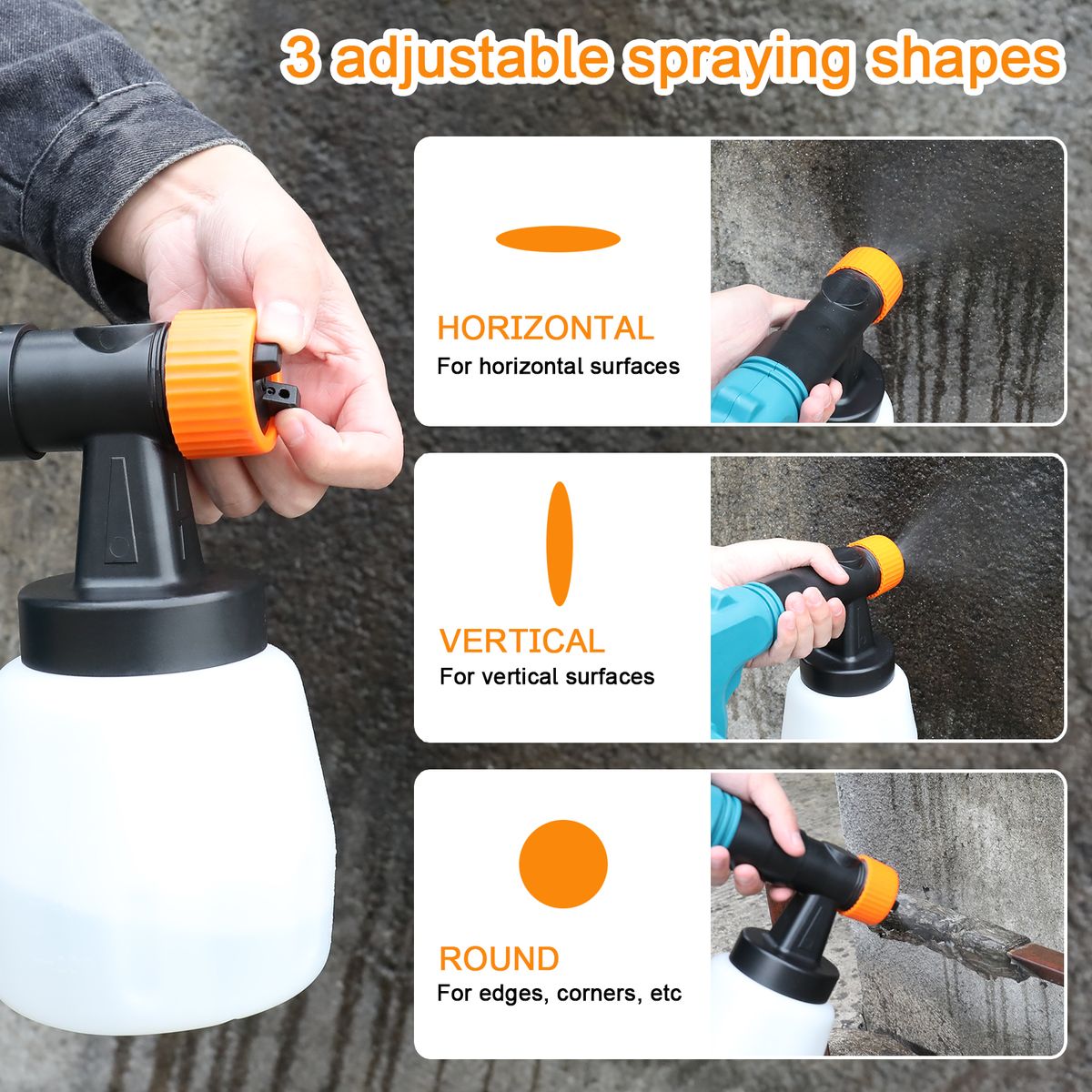3 adjustable spraying shapes: horizontal (for horizontal surfaces), vertical (for vertical surfaces), and round (for edges, corners, etc.).