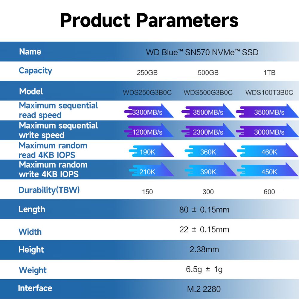 Durability: 150TBW(250GB), 300TBW(500GB), 600TBW(1TB)