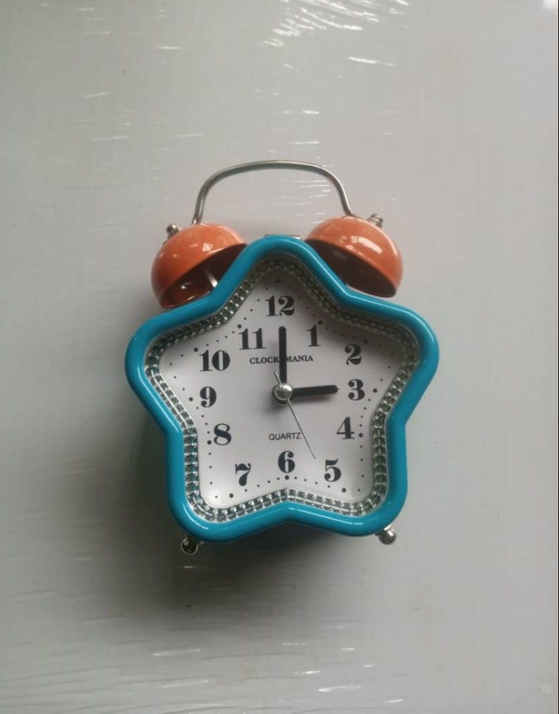 Clockamania's Blue Star with Orange bells alarm clock is an alarm clock with a small hammer in-between its pink bells. The hammer strikes the bells to create the alarm sound. It is loud enough to wake up a sleeping beauty. It has a small light inside the clock, to illuminate the face of the clock when it is dark. This light is controlled with a small button at the back of the alarm clock.The body is mainly made up metal and the face of the clock is made up of glass. It has two iron stands at the base of the clock, which helps to give the alarm clock balance even when the alarm goes off. It has two dials at the back, one dial is for adjusting the time, and the other dial is for adjusting the setting for the alarm. It is an excellent choice as a decor item for tables, shelves, cupboards or TV stands.