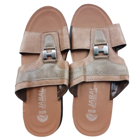 Men brown leather slip on shoe, brand jabal-polisico,brown color made in turkiye unique leather designs combination of animal skin size 44 color brown very light flat heel easy and light to move about unique design palm slide on shoe easy to move about combination of animal skin