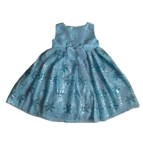 Sleeveless special occasion dress with lacy suplice bodice, ribbon bow waistband, and layered illusion skirt