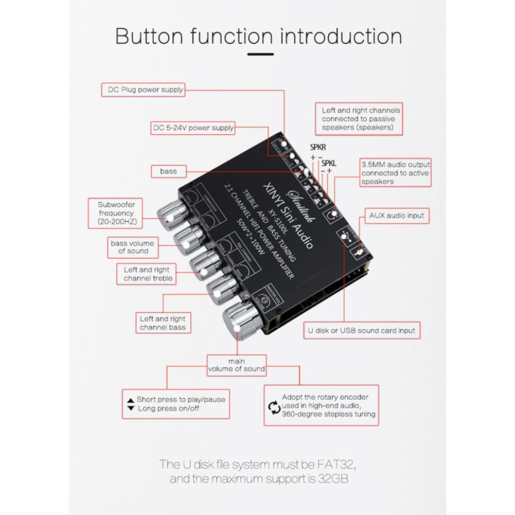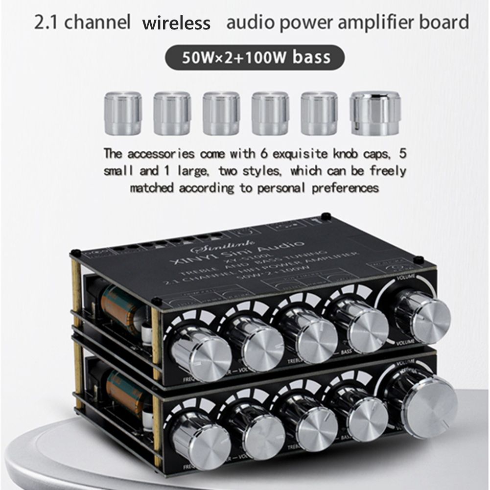 XY-S100L 2x50W + 100W HIFI Digital Power Subwoofer Amplifier Board Bluetooth-compatible 5.0 2.1 Channel Audio Stereo Equalizer Ba Amp Feature: Pure HIFI fever sound quality. The treble is pure and transparent, the midrange is gentle and delicate, and the ba is surging and shocking. Independent adjustment of left and right channel high and low ba, independent adjustment of heavy ba, 360-degree steple tuning. The large-area heat sink is made of special thermally conductive silicone paste, which is closely attached to the copper-clad shell for heat diipation. The heat diipation area is doubled to ensure that the product can run at full power and high performance. Mobile APP control. APP visual operation play mode. Support for Apple/Android (please download in Google market, search for "sinilink" to download). Claic appearance multi-function main knob. The main knob adopts a rotary encoder that is only used in high-end power amplifiers. It feels smooth and has a one-key start and stop. It is simple and convenient to operate by long preing the switch. Specification: Product model: XY-S100L Product name: 2.1 channel Bluetooth-compatible audio power amplifier board Power supply: above DC5-26V/10A Audio channel: 2.1 channel Bluetooth-compatible version: 5.0 Audio input: Bluetooth-compatible + AUX + U disk + USB sound card Audio output: Left and right channel + subwoofer + 3.5mm interface stereo output Volume adjustment: High-end encoder knob adjustment, smooth feel Frequency range: 20Hz-30KHz Signal-to-noise ratio: 92dB Output power: 50W*2 (left and right channels) + 100W (subwoofer) Satellite box (left and right channel) adapted speakers: 10W-100W/4Q-8Q Subwoofer adapted speakers: 20W-200W/4Q-8Ω Protection mechanism: Electrostatic protection, overcurrent protection, short circuit protection, overheating protection Unique function: Support Sinilink-APP control Product size: 95mm*88mm*25mm Product weight: 156g Note: Due to the different monitor and light effect, the actual color of the item might be slightly different from the color showed on the pictures. Thank you! Please allow 1-2cm measuring deviation due to manual measurement. 1 X Power Amplifier Board Set