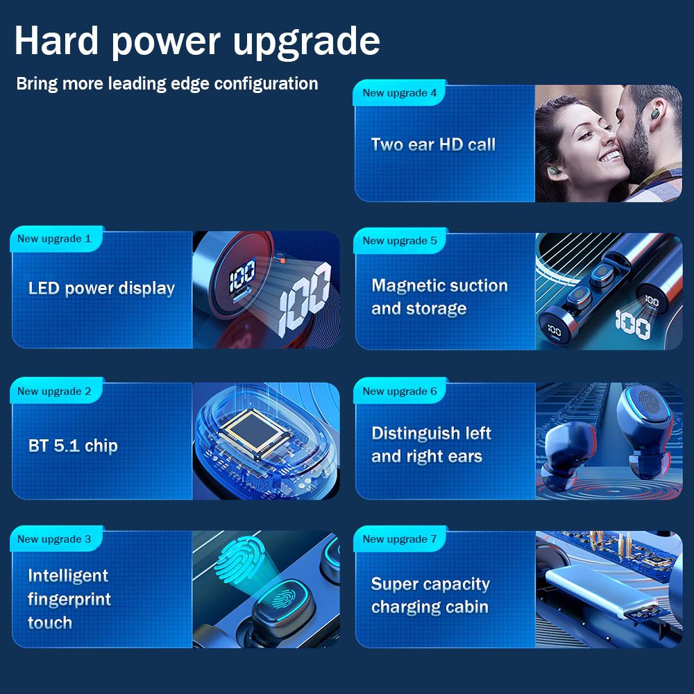BT 5.1 technology brings high-speed data transfer speed, stable performance, and low power consumption. With TWS technology, you can use the headset solely or used them in pairs. Auto fast pairing between left and right earbuds once taking out of the case. Equipped with a charging box to charge the earbuds. Built-in Microphone delivers clearer and more realistic sound. It will bring you a perfect user experience.